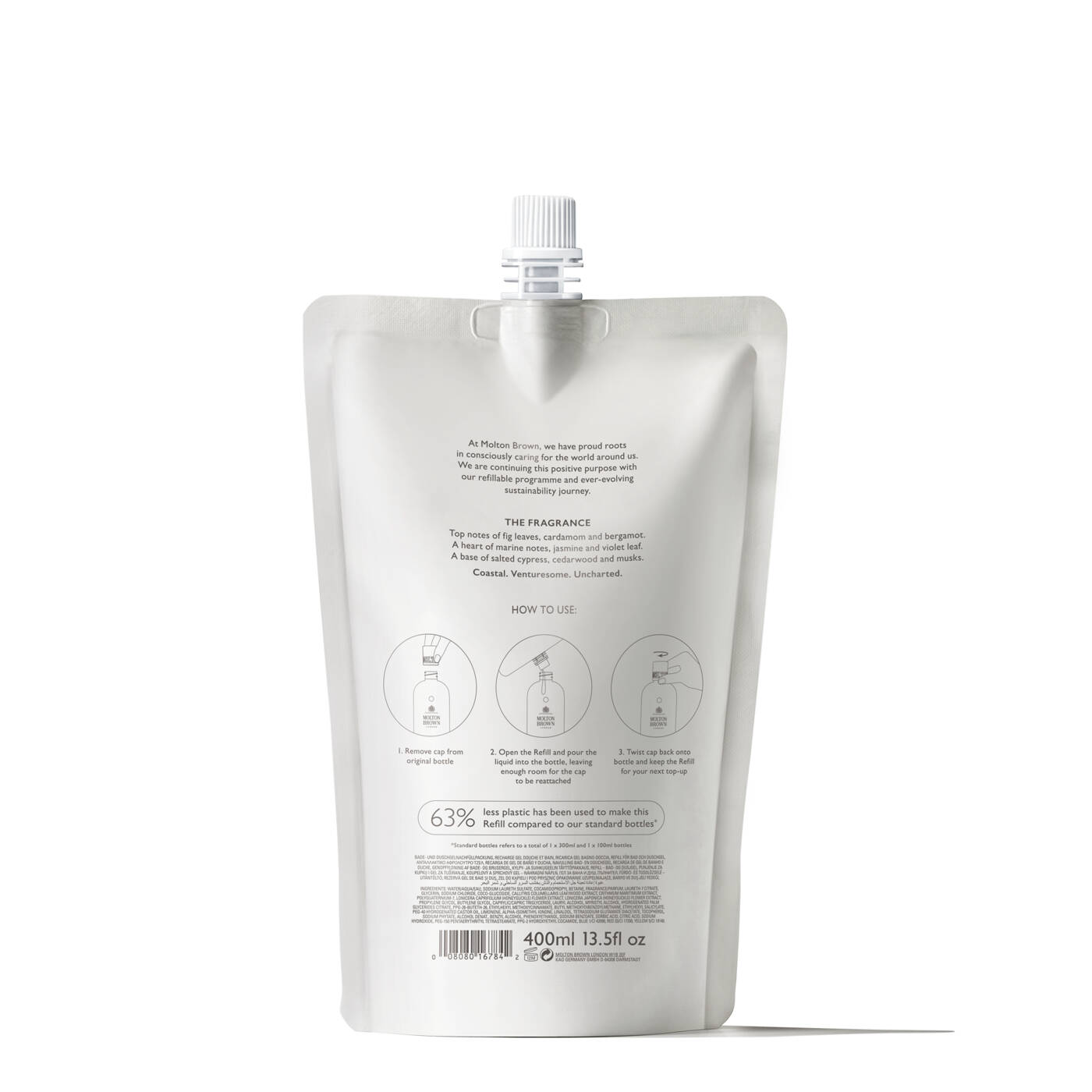 Ein 400-ml-Beutel, gefüllt mit unserem preisgekrönten Bade- und Duschgel, das zur Verwendung mit einer Handwaschgelflasche entwickelt wurde. Von erfrischendem Meeresduft umgeben, bedeutet dieser nachhaltige Umgang mit einem alltäglichen Ritual, dass Sie die belebende Erfahrung immer und immer wieder machen können. Im Vergleich zu unseren Standardflaschen (insgesamt 1 x 300ml und 1 x 100ml) wurde für die Herstellung dieser Nachfüllflasche 63% weniger Plastik verwendet.