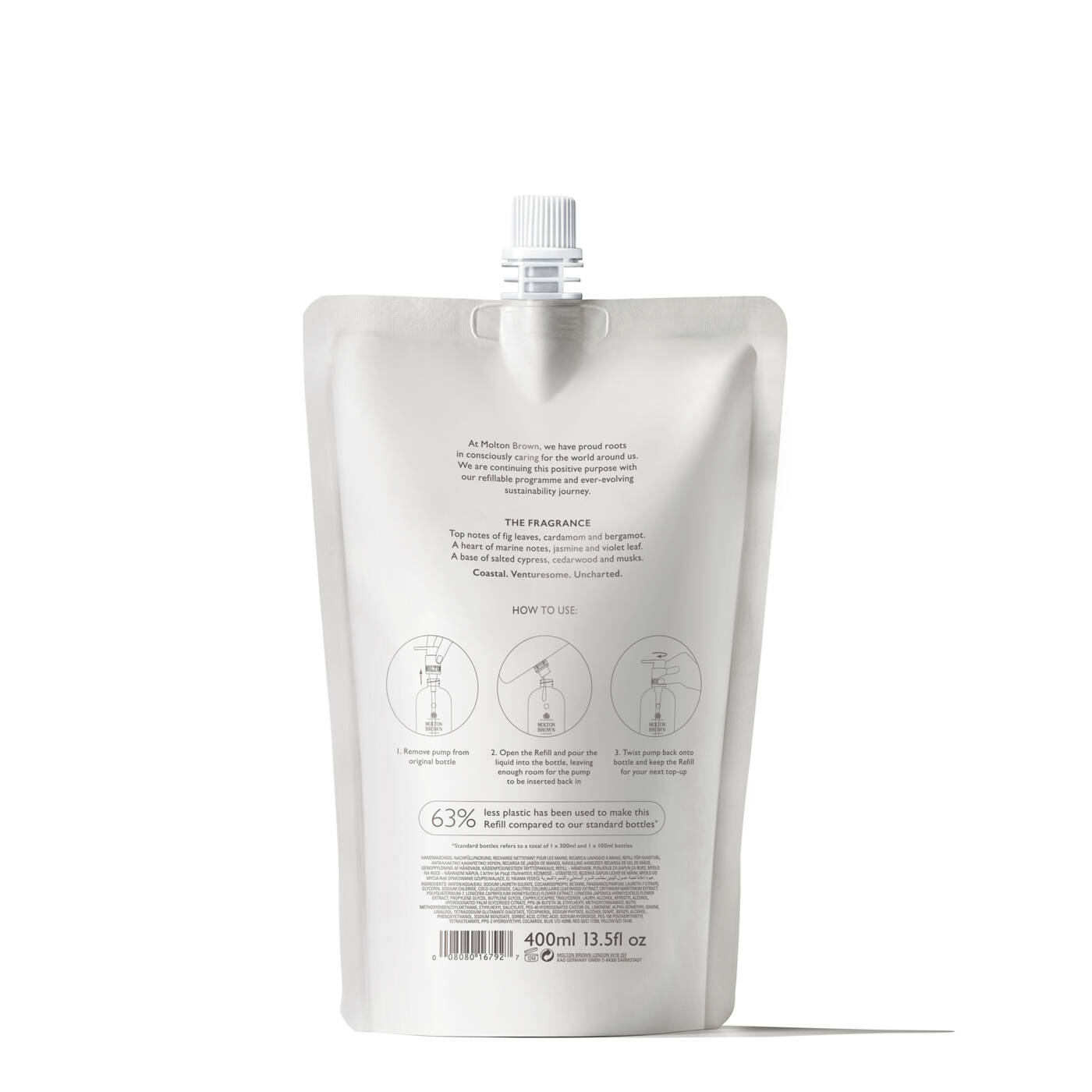 Ein 400 ml-Beutel gefüllt mit unserem preisgekrönten, belebenden edlen Handwaschgel, das die Hände gründlich reinigt und ihnen einen wunderbaren Duft verleiht. Mit einem erfrischenden, maritimen Duft entscheiden Sie sich für ein tägliches Ritual, bei dem Sie Ihre leere Handwaschgelflasche immer wieder neu auffüllen können.