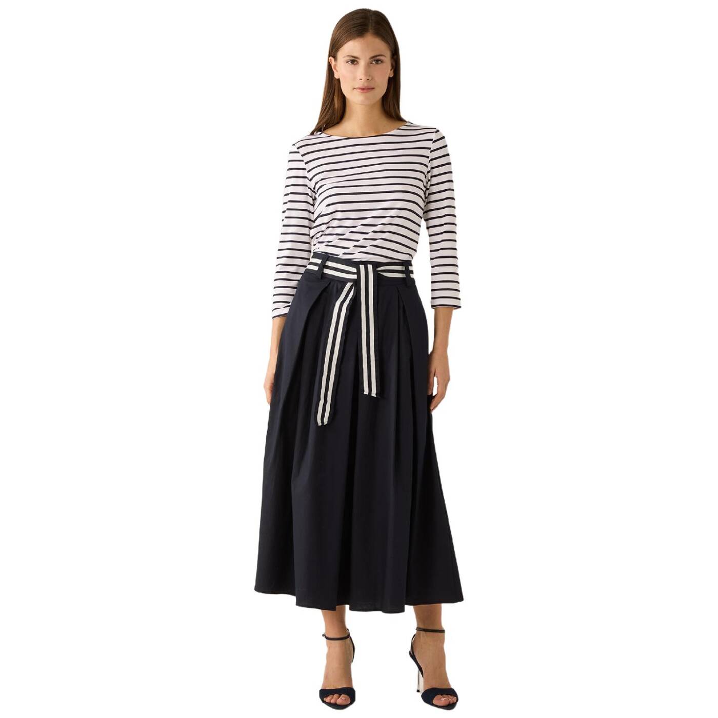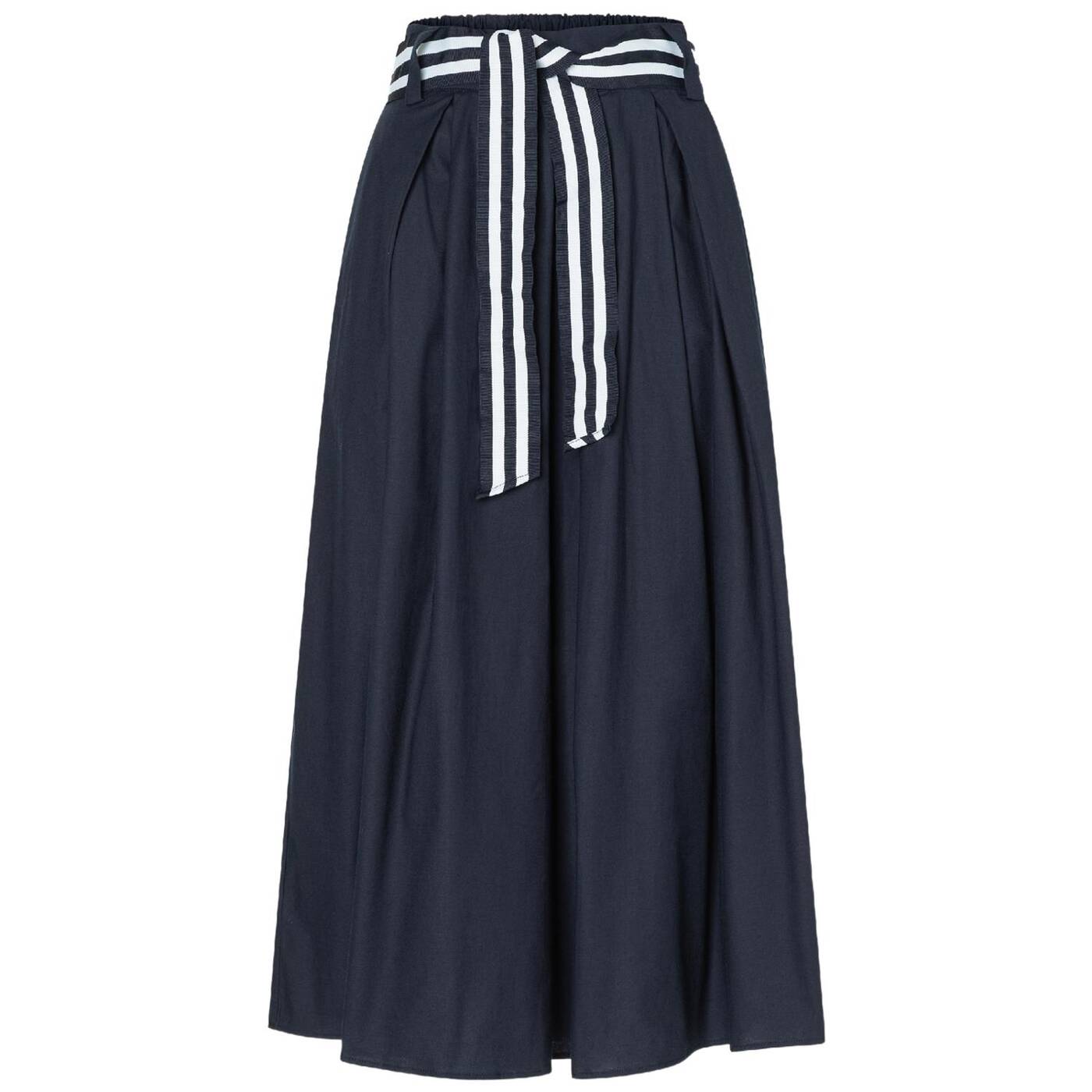 Der ausgestellte baumwollrock von more & more mit gestreiftem bindegürtel und kellerfalten vorne lässt sich sehr vielseitig kombinieren. sie können ihn wahlweise ganz casual mit t-shirt und sneakers stylen oder aber etwas eleganter mit blusentop und heels. der weite shape und der teilelastische bund bieten einen hohen tragekomfort, während der kontrastfarbige streifengürtel dem rock eine sportive note verleiht - ein perfekter begleiter für moderne casual-looks.