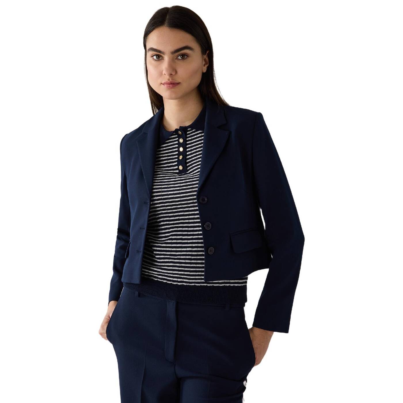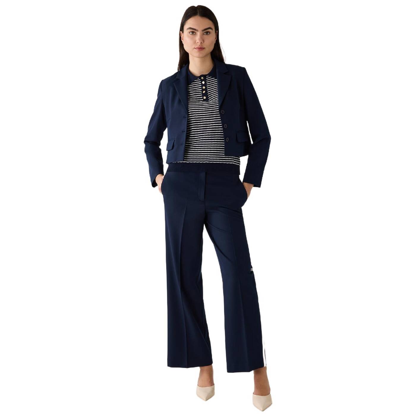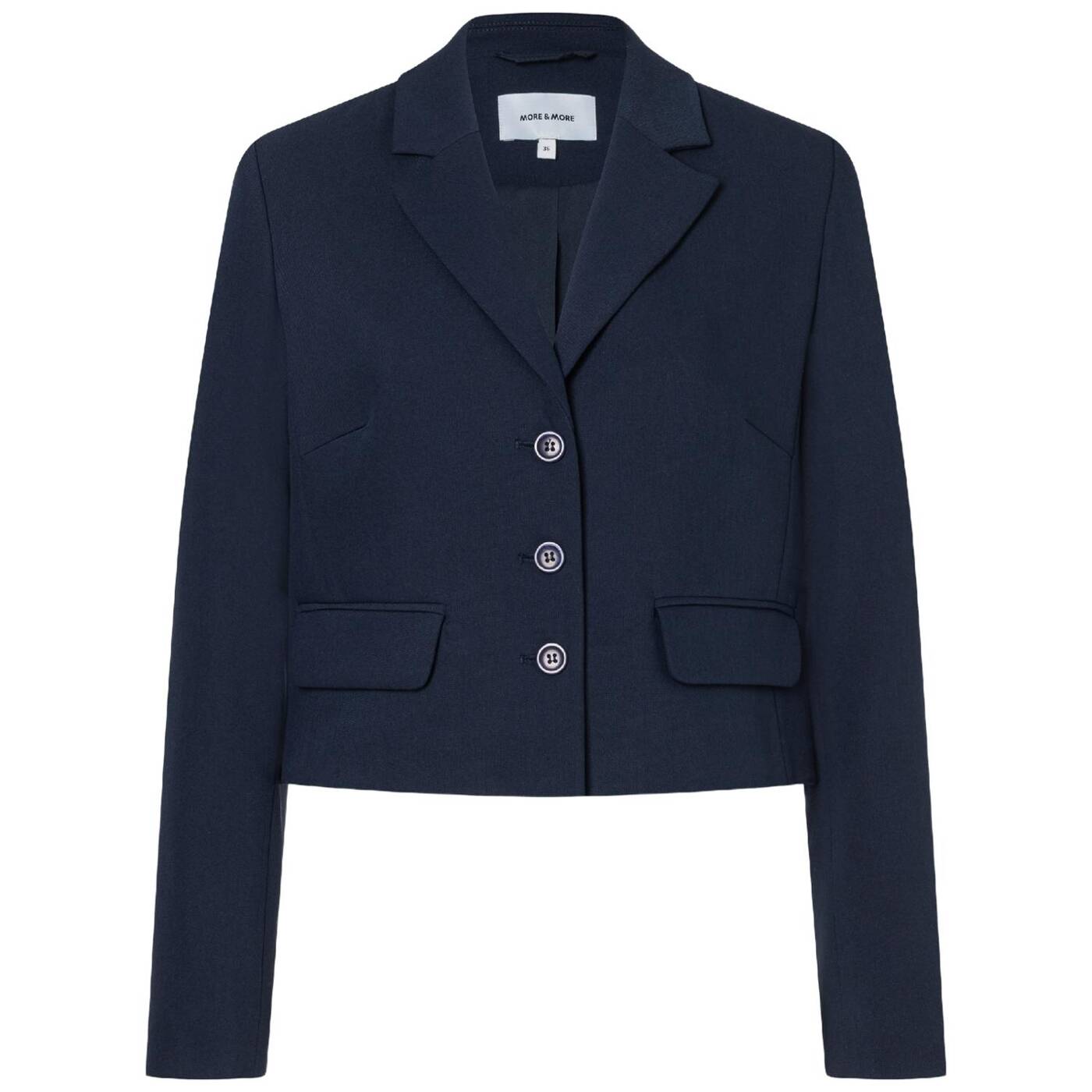 Die kurze blazerjacke von more & more wird mit passender weiter hose zum neuen office-look. natürlich kann man das kurze jäckchen auch sehr gut zu röcken und kleidern kombinieren und sogar mit verwaschener jeans, ringelshirt und sneakers wird ein tolles outfit daraus.