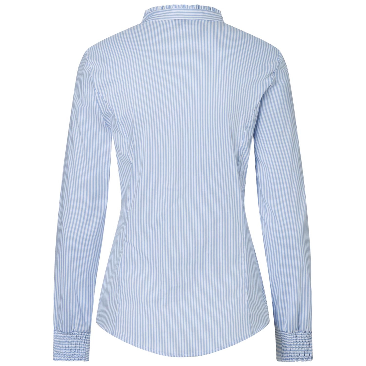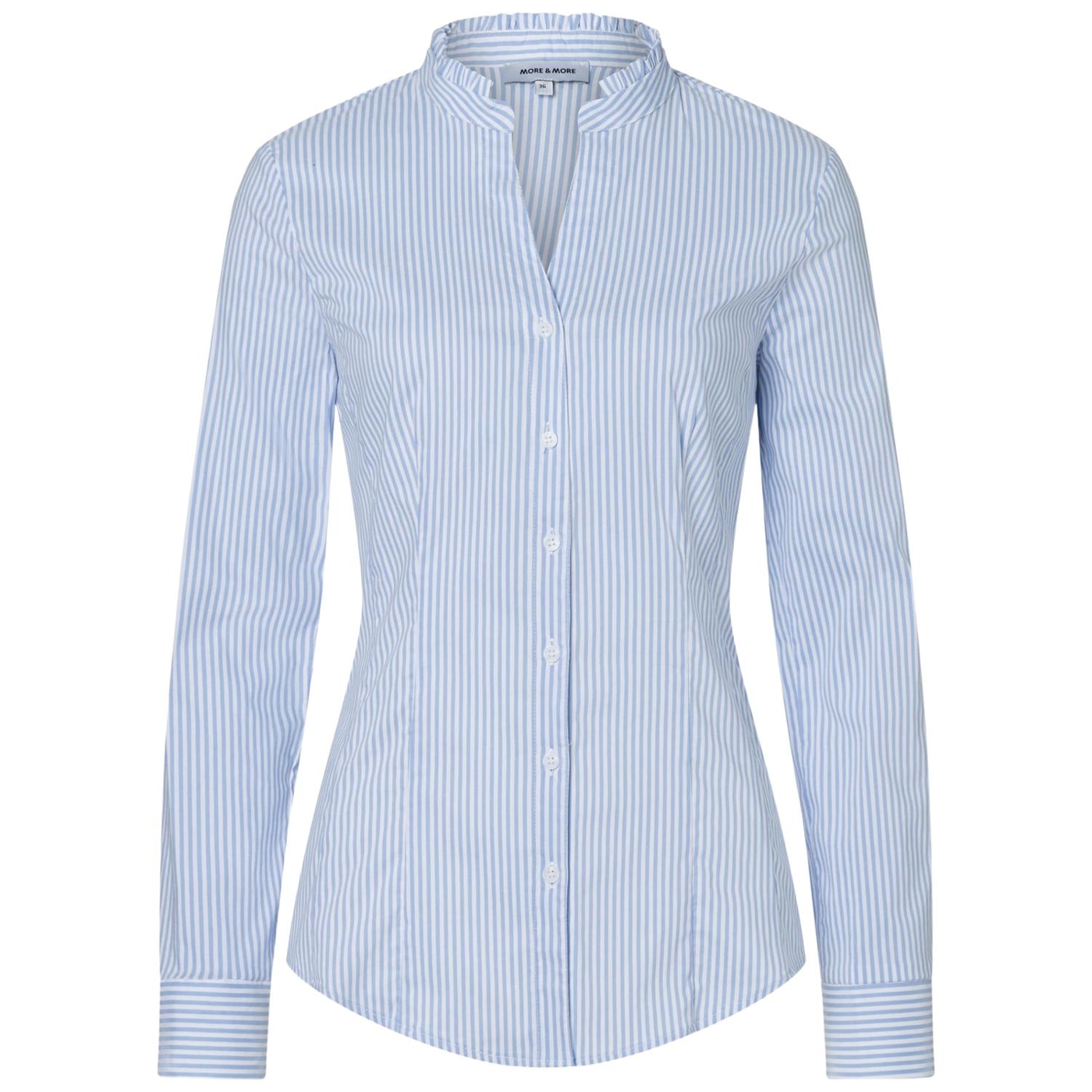 Die feminine Baumwoll/Stretch Bluse in hellblau/weiß gestreift von MORE & MORE mit kleinem Stehkragen und Rüschenkante sieht unter Blazern, Cardigans und Pullovern gleichermaßen gut aus.