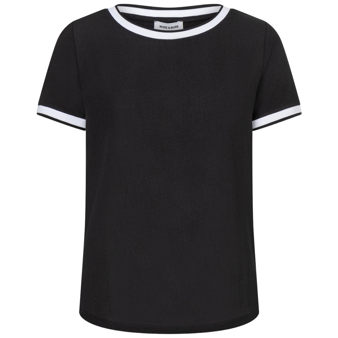 Das feminine Shirt von MORE & MORE mit fließender Webfront und hellen Kontrast-Abschlüssen bietet eine tolle Mischung aus Bluse und T-Shirt. Es kann sowohl zum klassischen Businessanzug kombiniert werden, sieht aber genauso gut zur lässigen Jeans, sportiven Chino oder zum weiten Glockenrock aus.