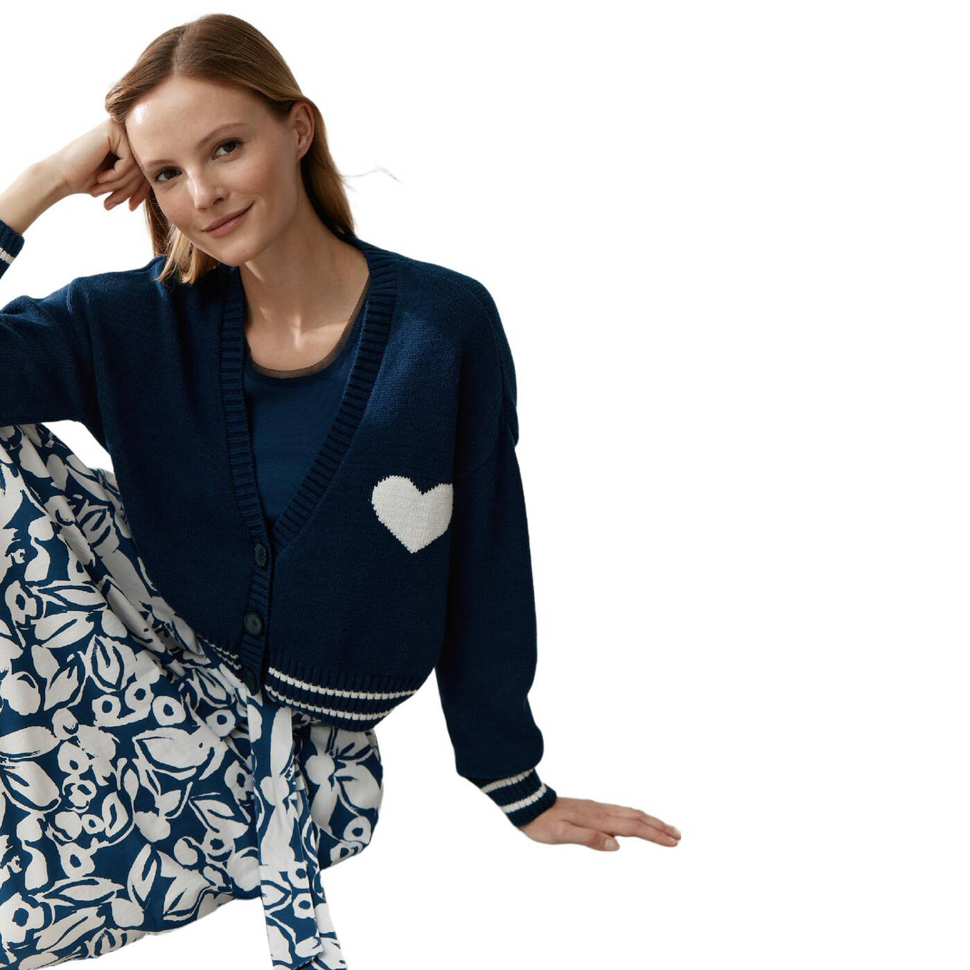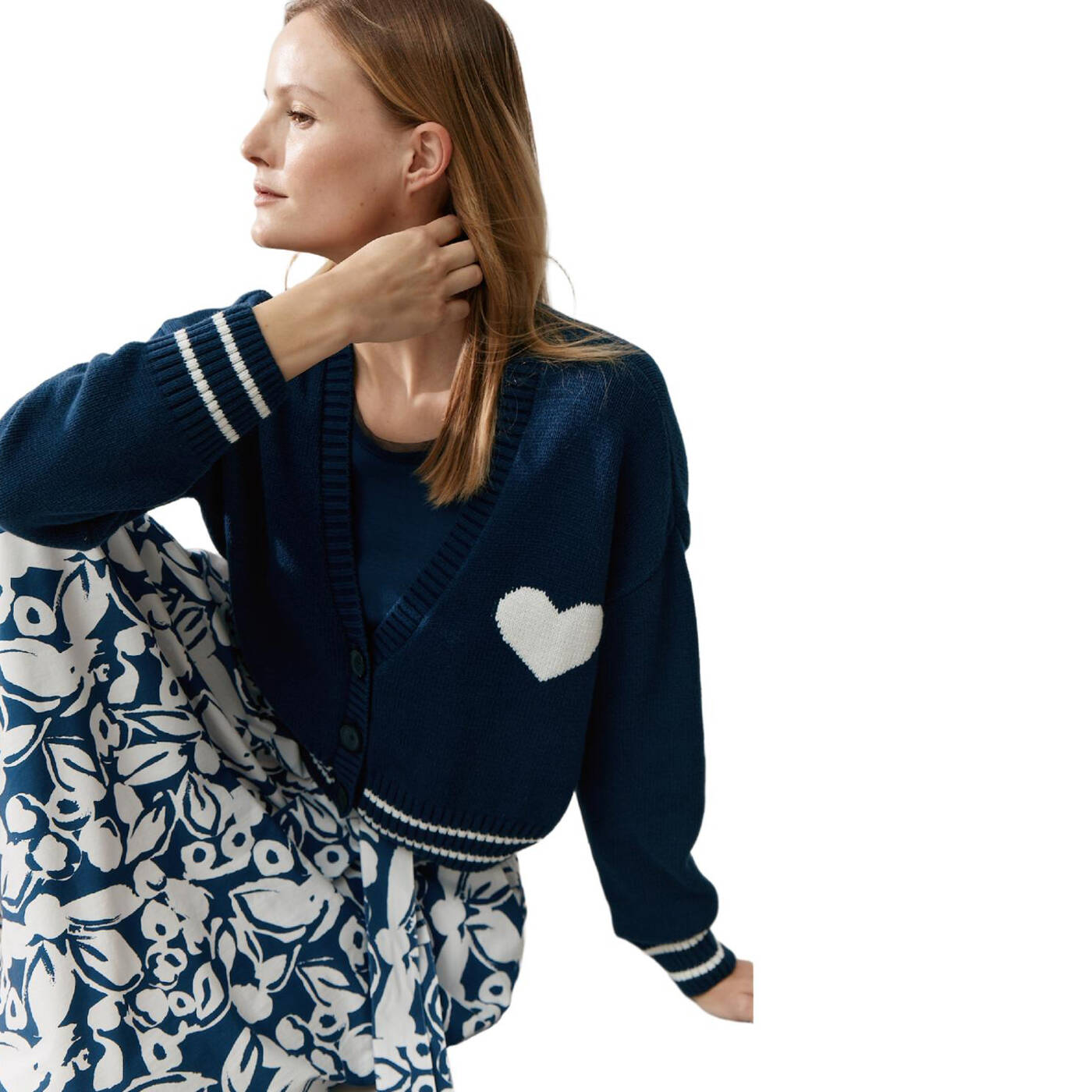 Der dunkelblaue cardigan von more & more wird sicher ein lieblingsstück in ihrem kleiderschrank. das weiße herz setzt einen süßen akzent und macht den look besonders lässig, zeitlos und perfekt zum kombiieren - ideal für jeden tag.