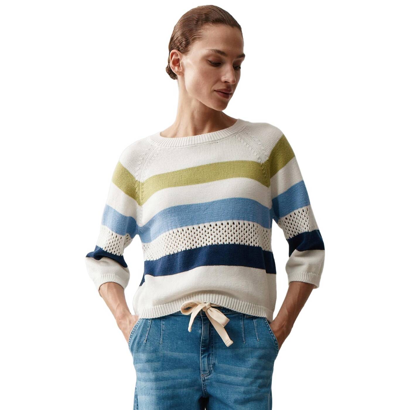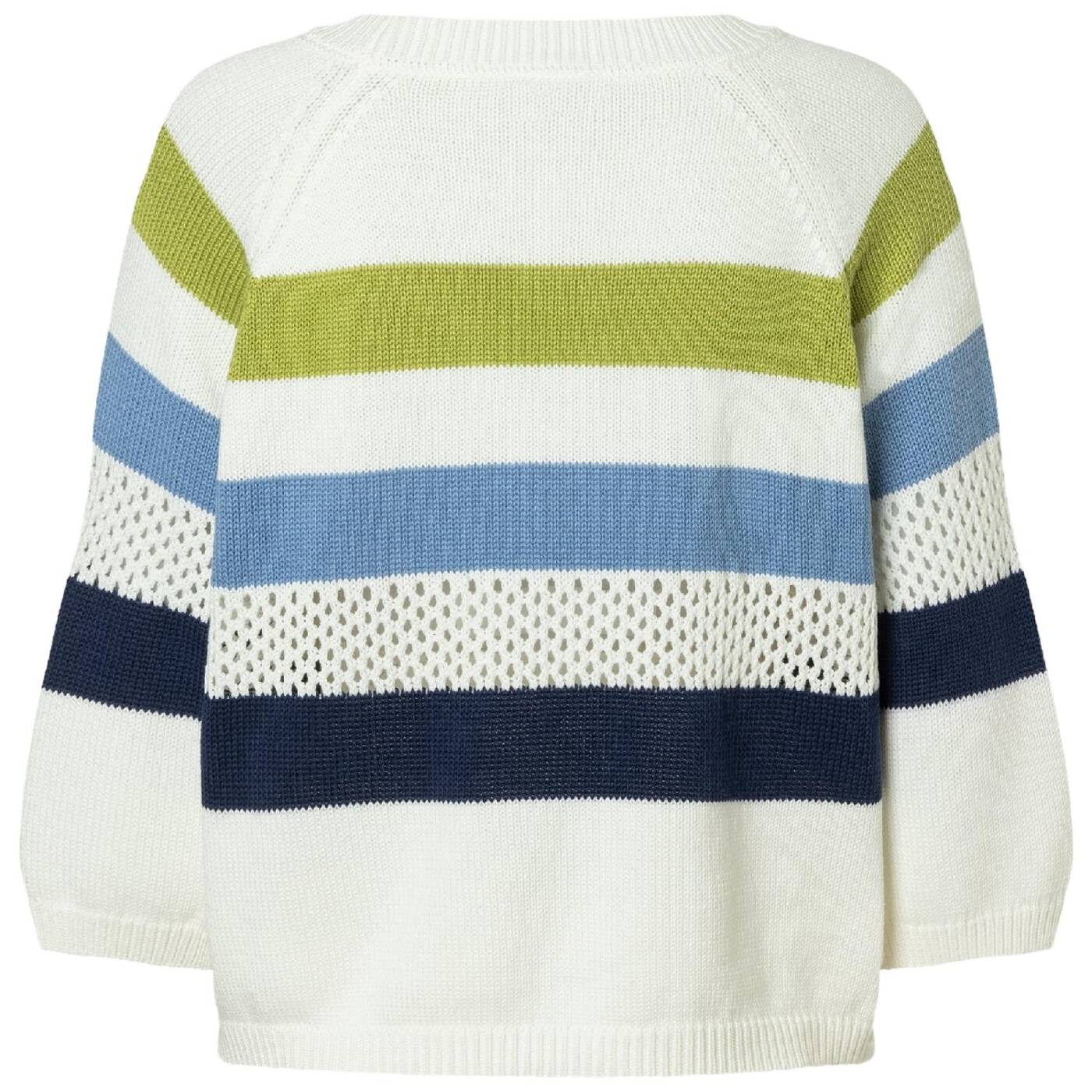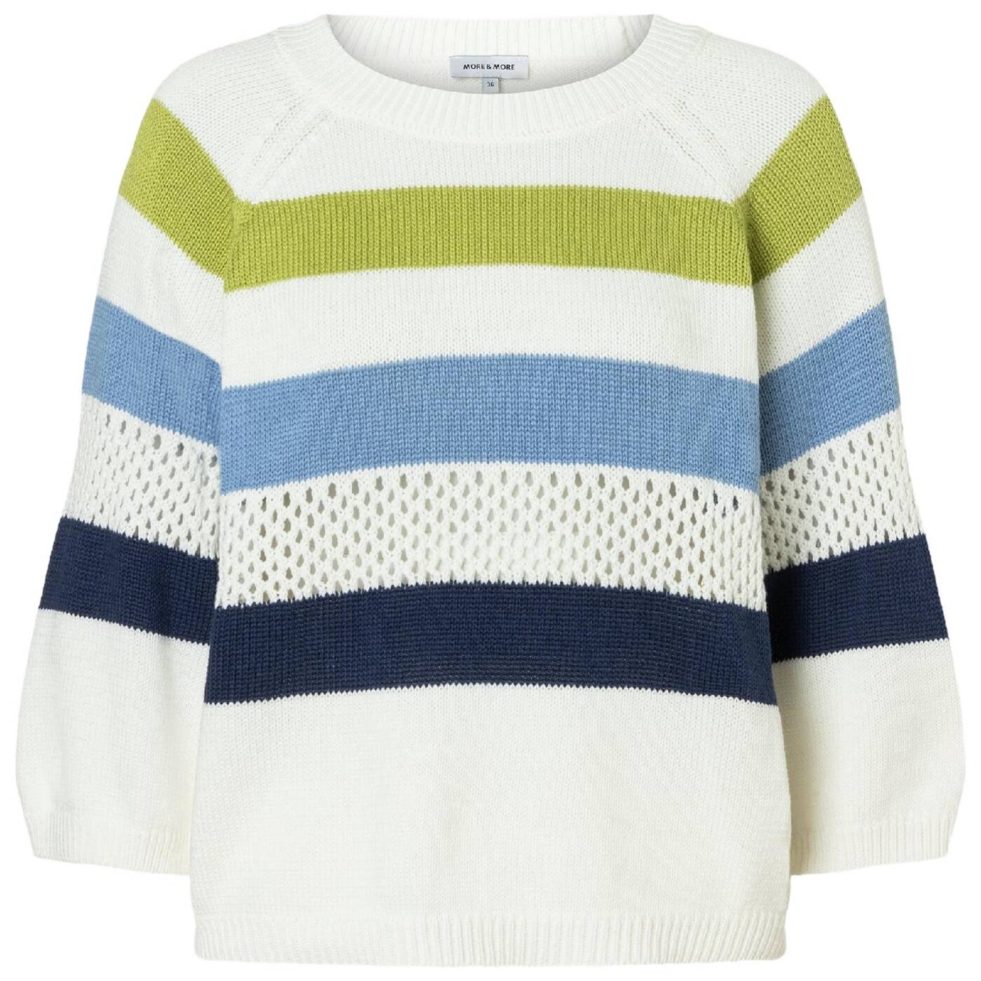 Dieser leichte strickpullover von more & more bringt sommerliche frische in ihre garderobe. die harmonischen streifen in weiß, grün, hellblau und navy sorgen für einen modernen, lässigen look. dezente lochstrick-details setzen stylische akzente und machen das design besonders. der lockere schnitt mit überschnittenen schultern und 3/4-ärmeln sorgt für ein entspanntes tragegefühl – perfekt für easy everyday-outfits. einfach mit jeans oder stoffhose kombinieren und fertig ist ihr neuer lieblingslook.