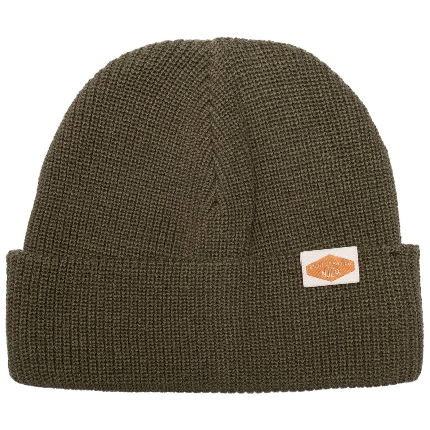 Doppelt umschlagbare Beanie aus Bio-Baumwoll-Rippstrick mit trockenem Griff. Ein cremefarbenes Logo-Label ist um den Rand gelegt.