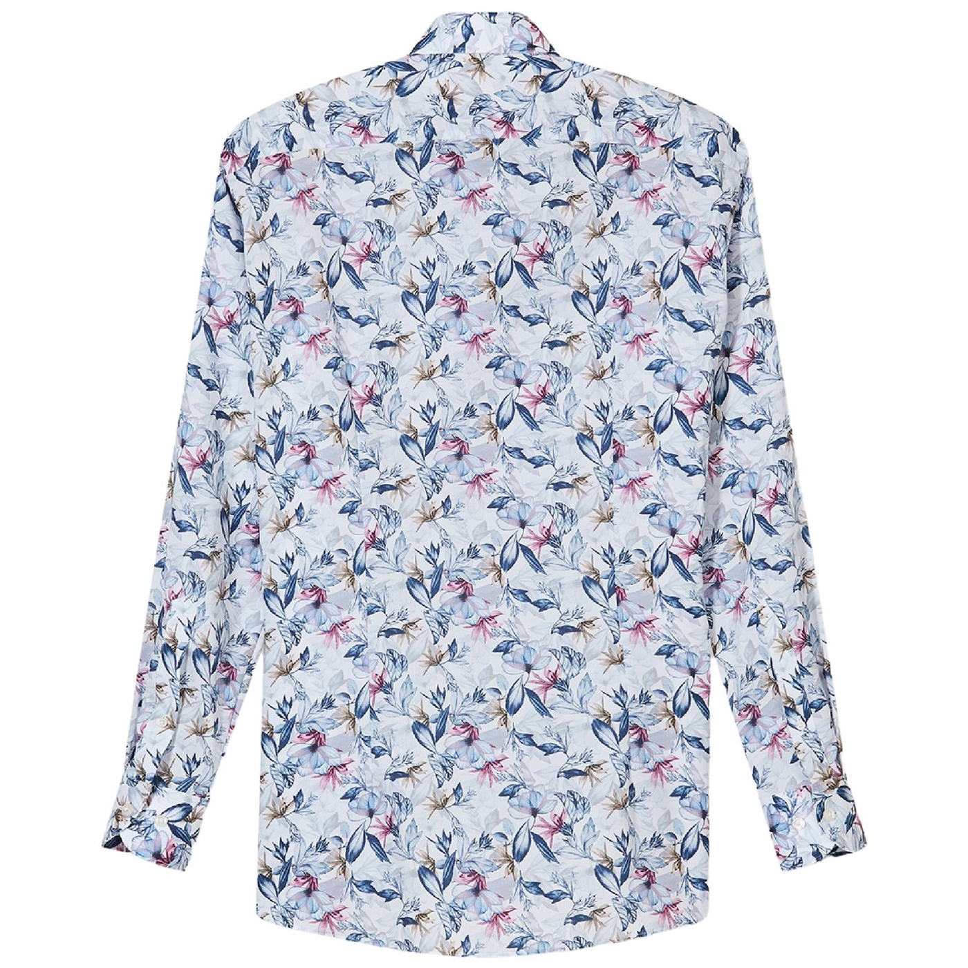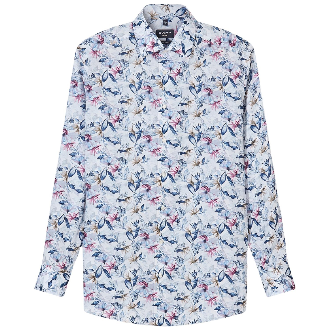 Floraler Print trifft auf Twill aus 100% Baumwolle. Das OLYMP Luxor Hemd ist in comfort fit oder modern fit erhältlich, jeweils mit New Kent Kragen und mehrfarbigen Blütenmotiven auf weißem Grund in Blau-, Pink- und Beigetönen. Helle Knöpfe setzen einen klaren Abschluss. Das glatte, leichte Gewebe trägt sich angenehm und bleibt im Alltag gepflegt.