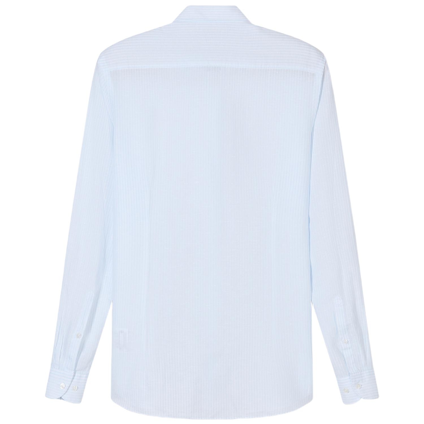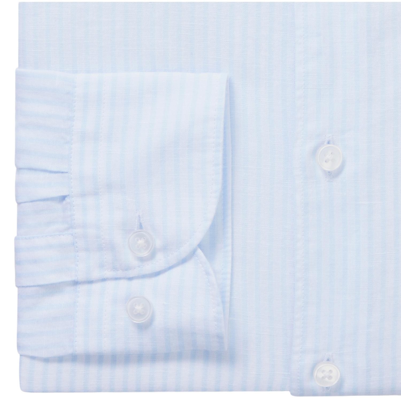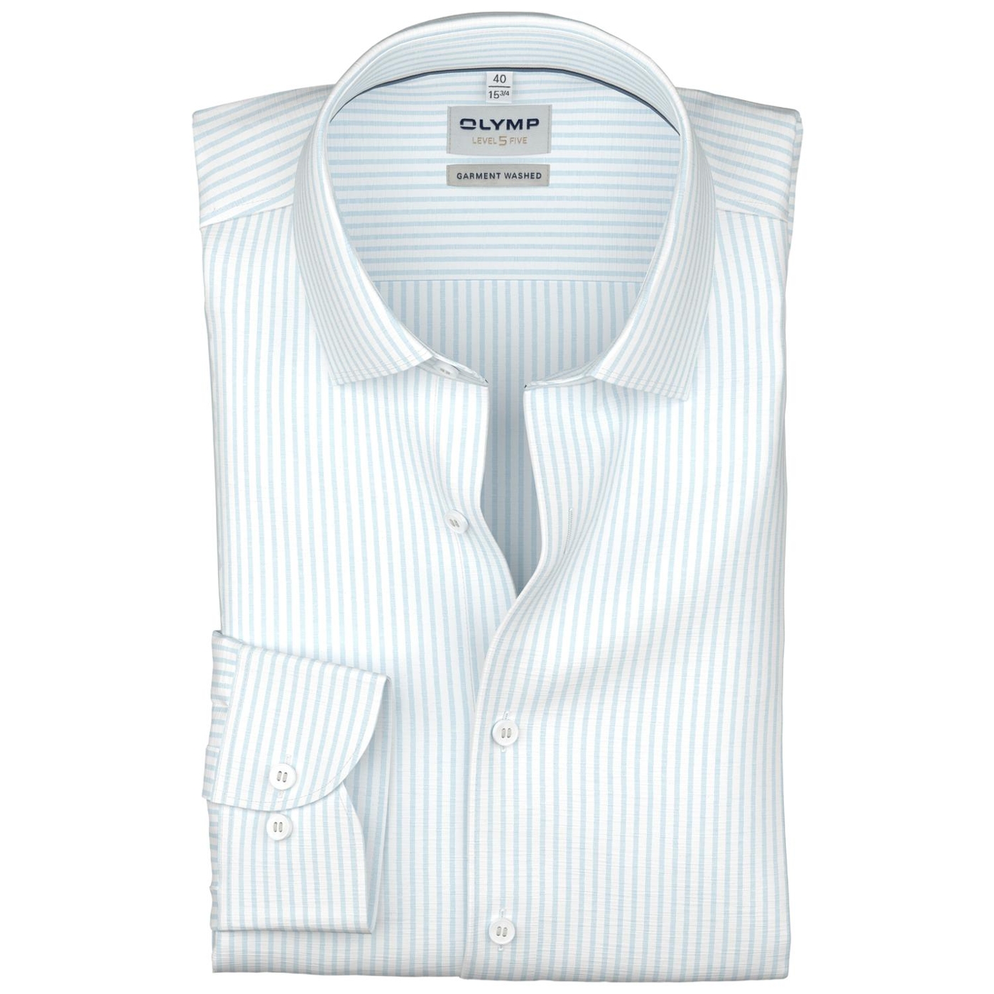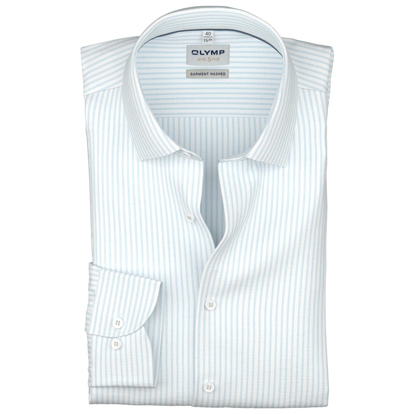 Garment Washed OLYMP Hemd aus 57% Leinen und 43% Baumwolle. Hellgraue Streifen auf Weiß setzen einen klaren Look. body fit für eine körpernahe Passform. Kent-Kragen und Knopfleiste mit weißen Knöpfen. Die glatte Webware wirkt gepflegt und bleibt auch bei vollem Tag zuverlässig.