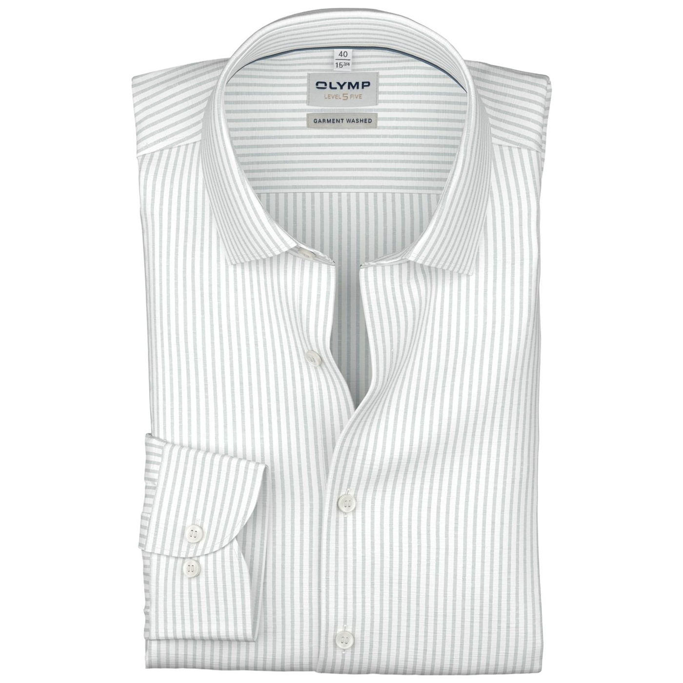 Garment Washed OLYMP Hemd aus 57% Leinen und 43% Baumwolle. Hellgraue Streifen auf Weiß setzen einen klaren Look. body fit für eine körpernahe Passform. Kent-Kragen und Knopfleiste mit weißen Knöpfen. Die glatte Webware wirkt gepflegt und bleibt auch bei vollem Tag zuverlässig.