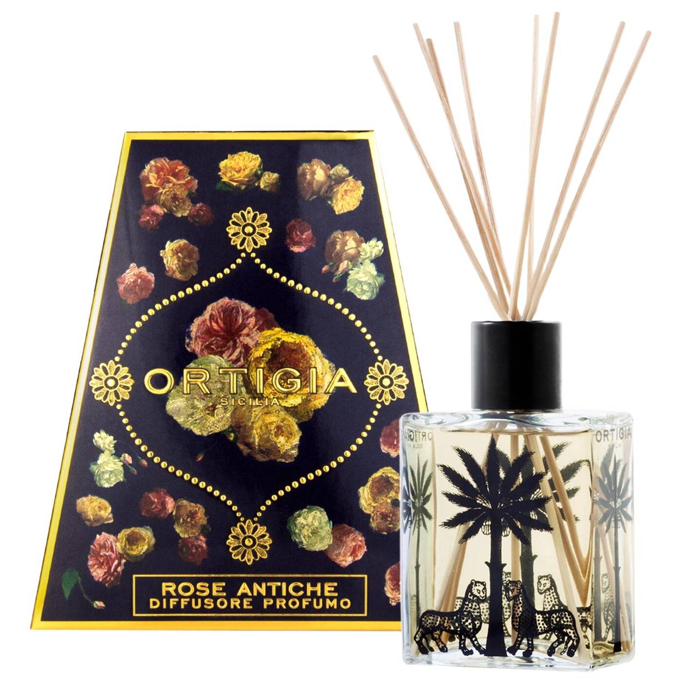 Naturstäbchen in einem eleganten Flakon. Die parfümierte Flüssigkeit durchdringt die Stäbchen und verströmt einen dezenten, anhaltenden Duft von Damaszener- und Alba-Rosen.