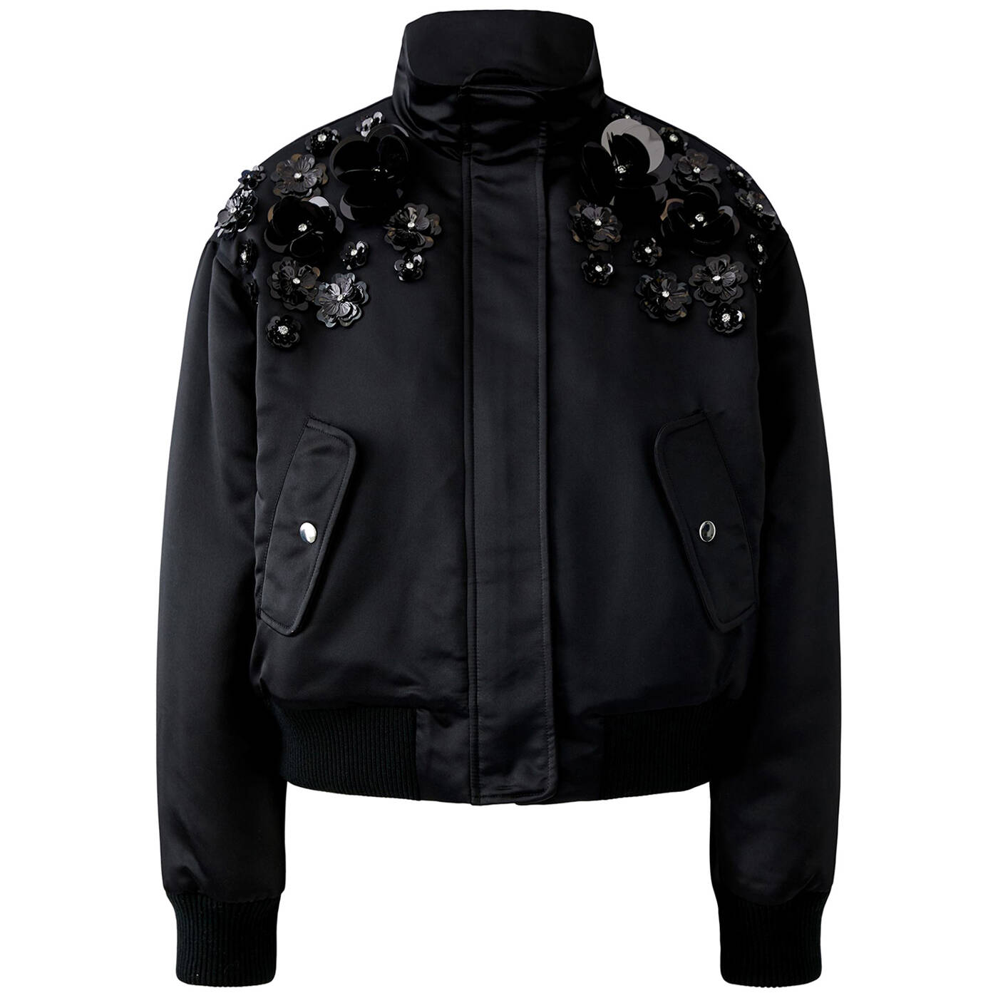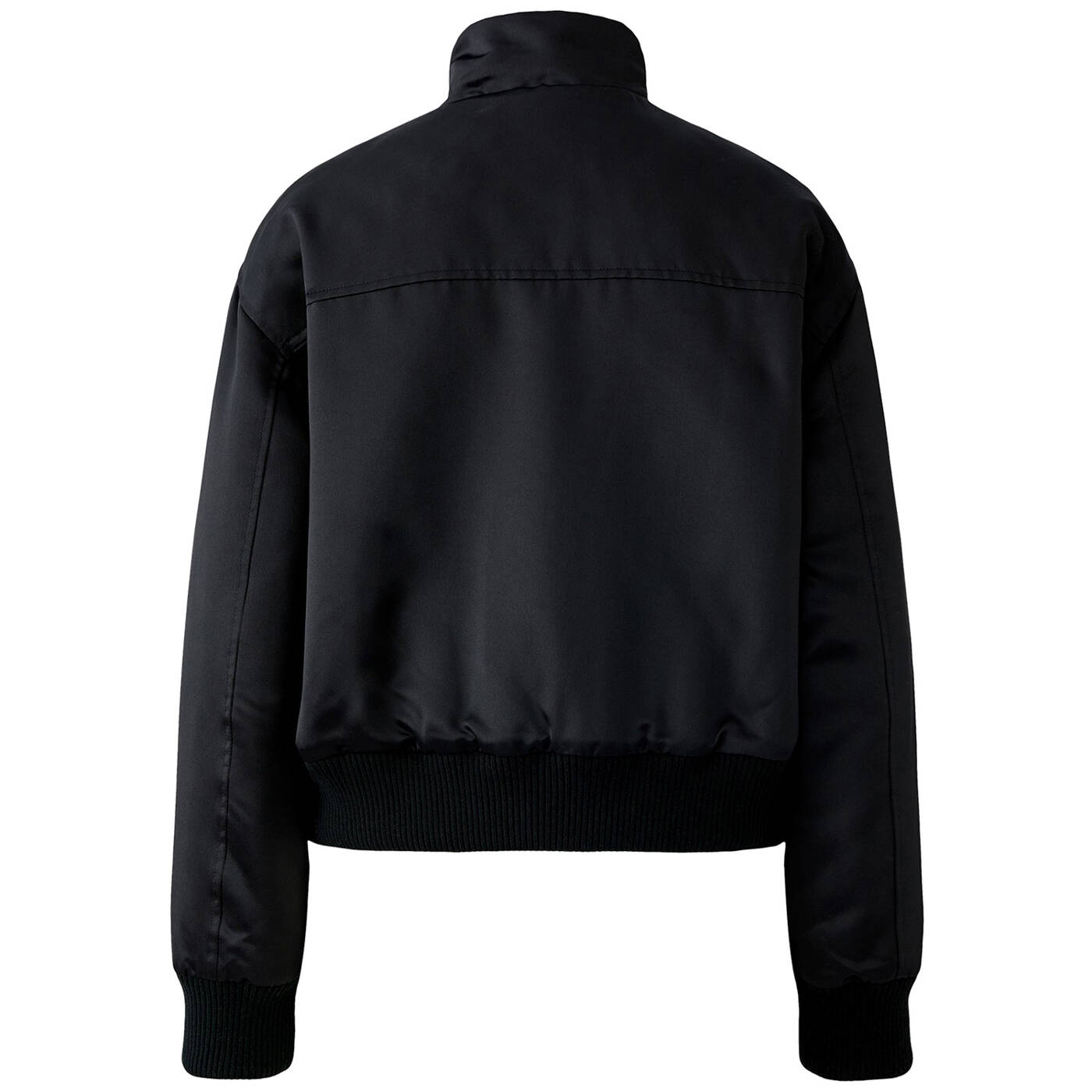 Glänzender Satin, leichtes Padding, gestepptes Futter Lässig geschnitten, verkürzte Länge Stehkragen Verdeckter Metallreißverschluss schließt bis zum Stehkragenende, Übertritt wird mit Druckknopf fixiert Typische Strickbündchen am Ärmel und Saum Pattentaschen mit Druckknopfverschluss