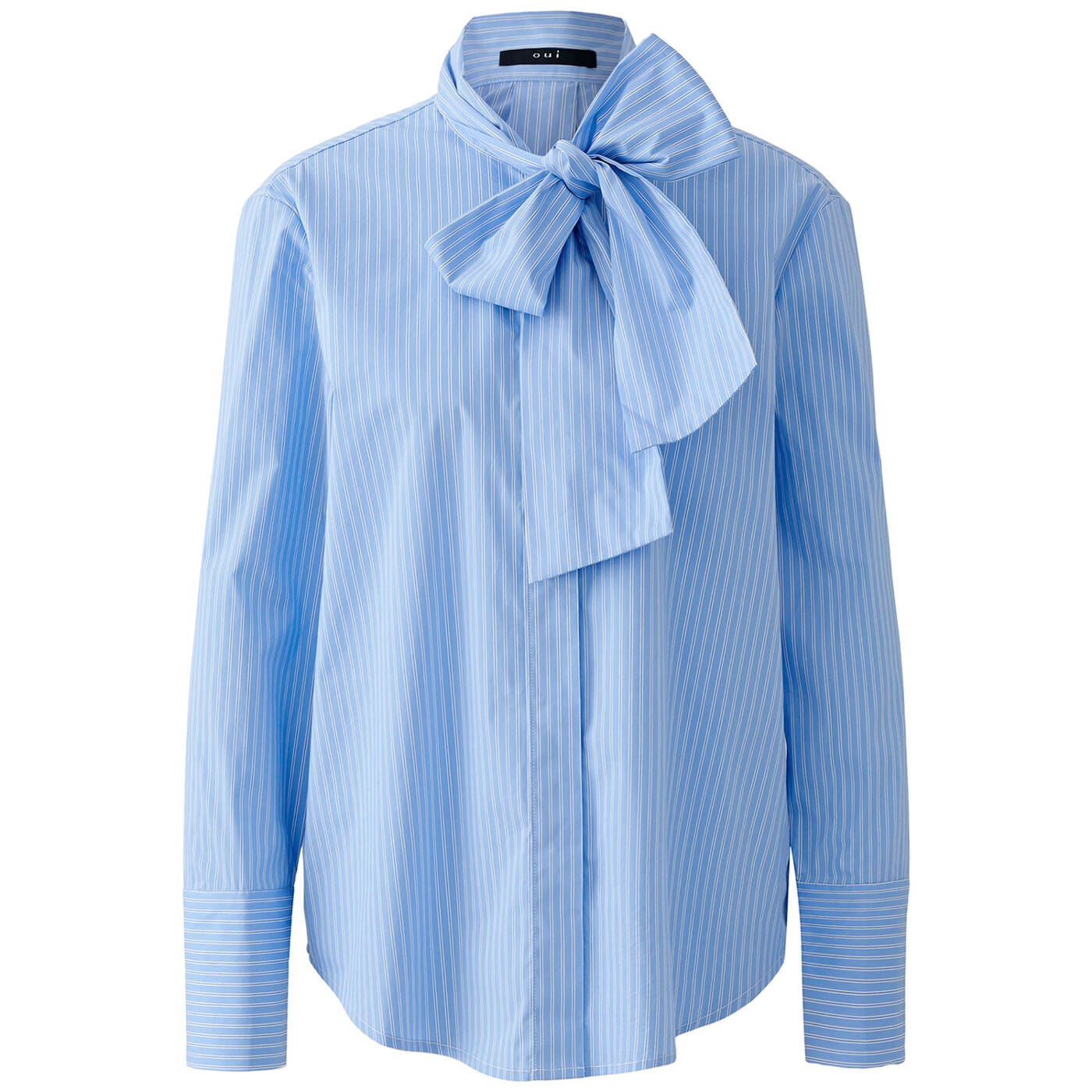 Elastische Baumwollmischung in Streifen gewebt Lässig geschnitten, etwas länger Kurzer Stehkragen mit Schluppe zum Binden Leicht überschnittene Schulter mit Langarm, lange Manschette zum Umschlagen Verdeckte Knopfleiste Überlappende Falte am Rücken für zusätzliches Volumen und Bequemlichkeit