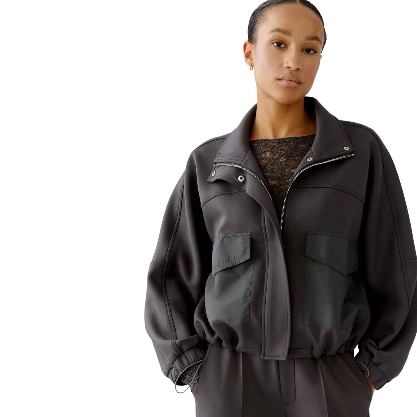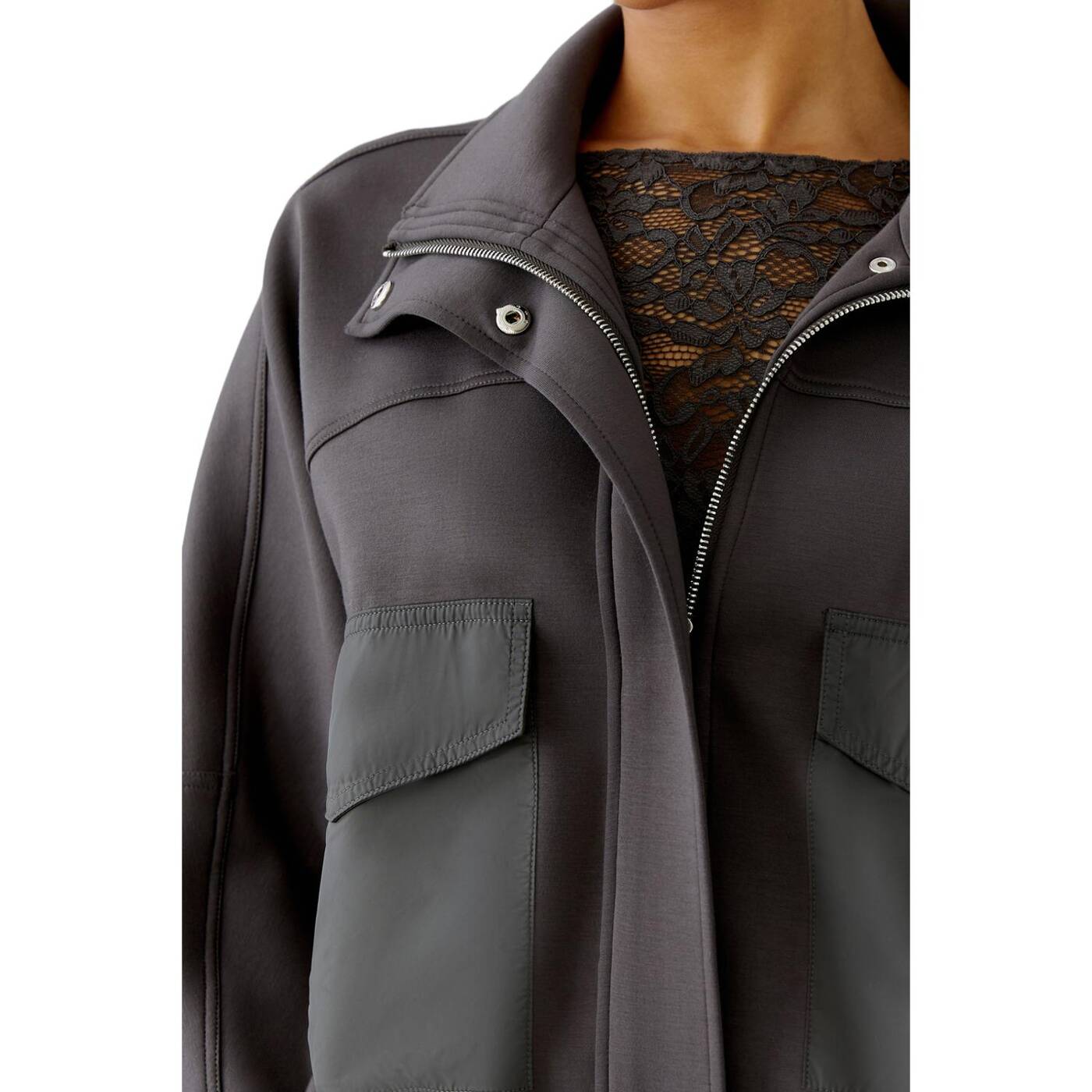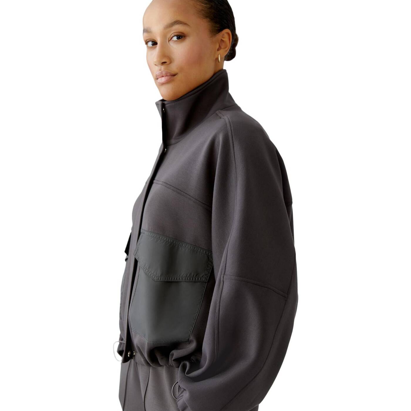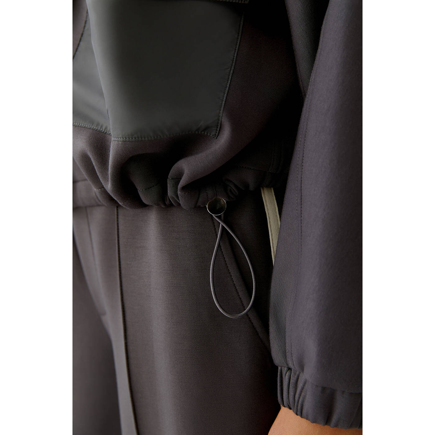 Scuba Stoffe zeichnen sich durch eine neoprenähnlichen Oberseite und eine jerseyähnlichen Unterseite aus mit super weichem Griff Oversized geschnitten, reguläre Länge Stehkragen mit Druckknopfleiste und verdecktem Reißverschluss Aufgesetzte Pattentaschen aus Nylon Tunnelzug am Bund mit elastischer Kordel und wertigen Metallstoppern, um die Weite anzupassen