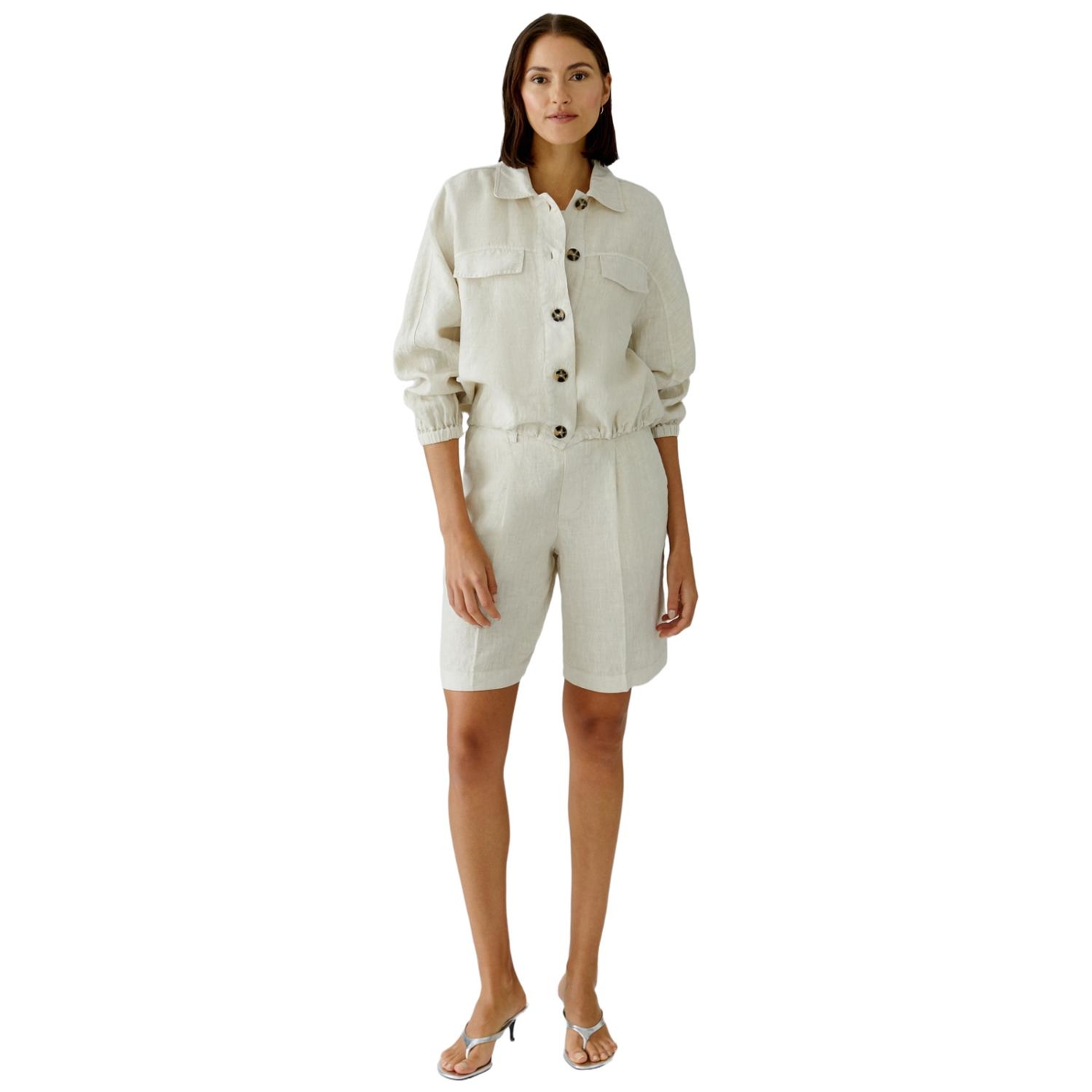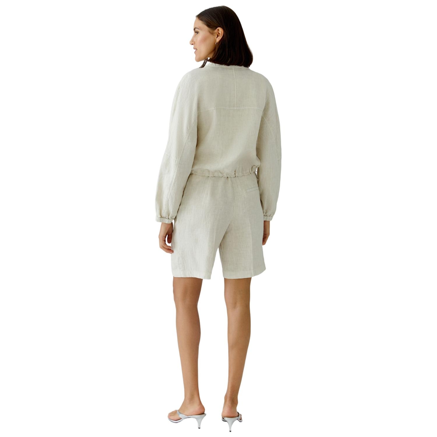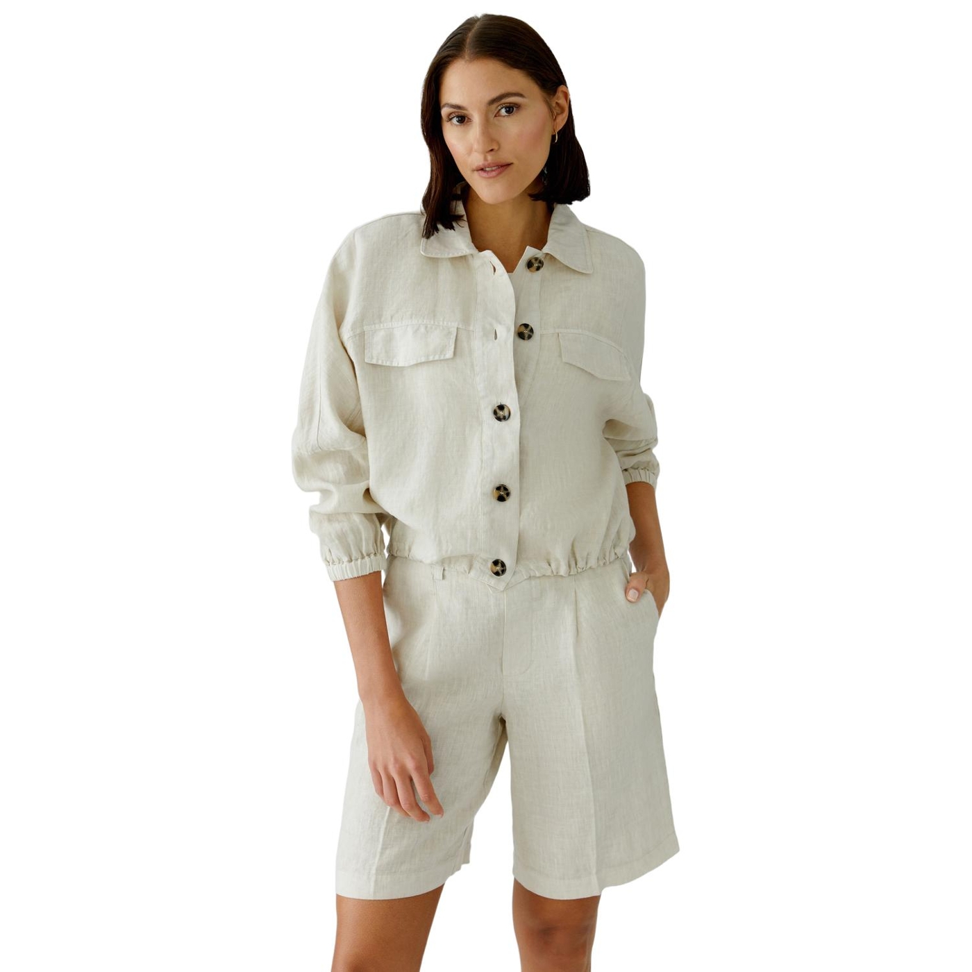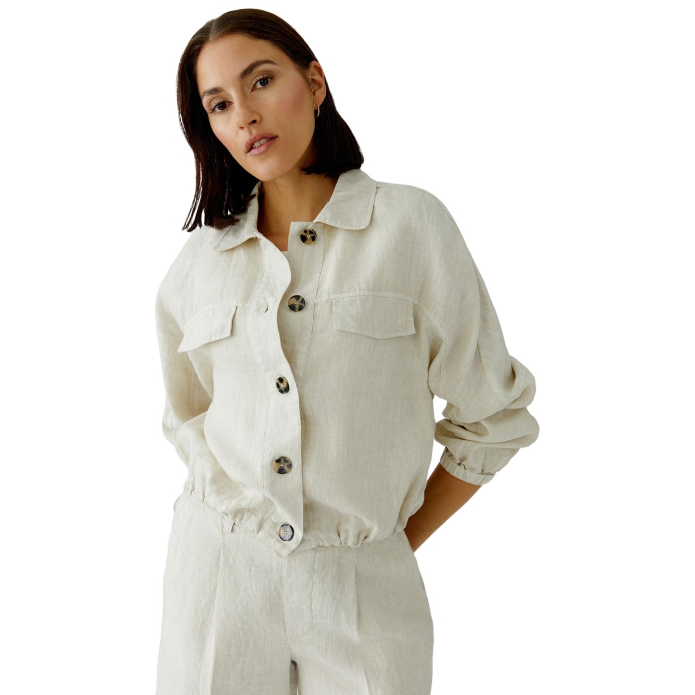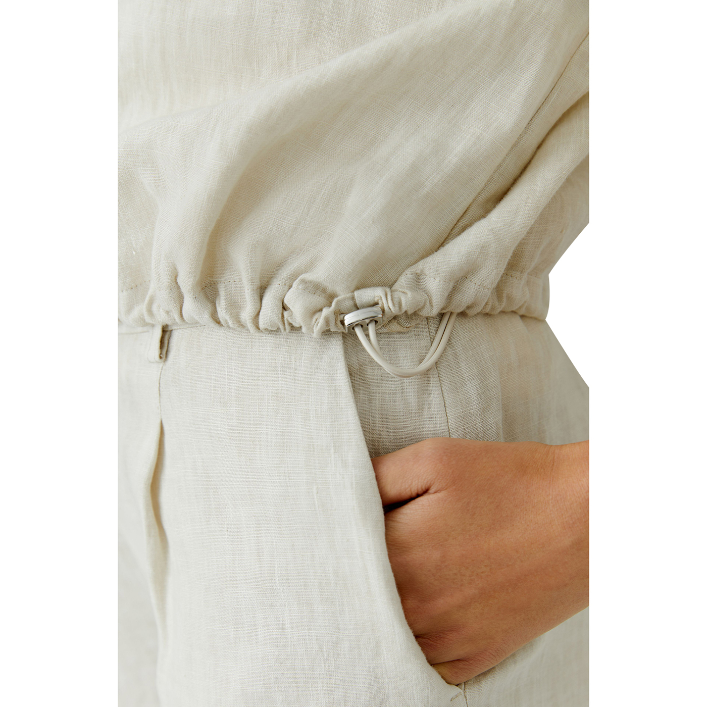 Reines Leinen Lässig geschnitten, verkürzte Länge Klassischer Hemdblusenkragen mit breiter Knopfleiste Leicht überschnittene Schulter, Langarm mit Gummibündchen Am Saum mit Tunnelzug und Gummiband, die Weite kann durch Raffung und Stopper angepasst werden