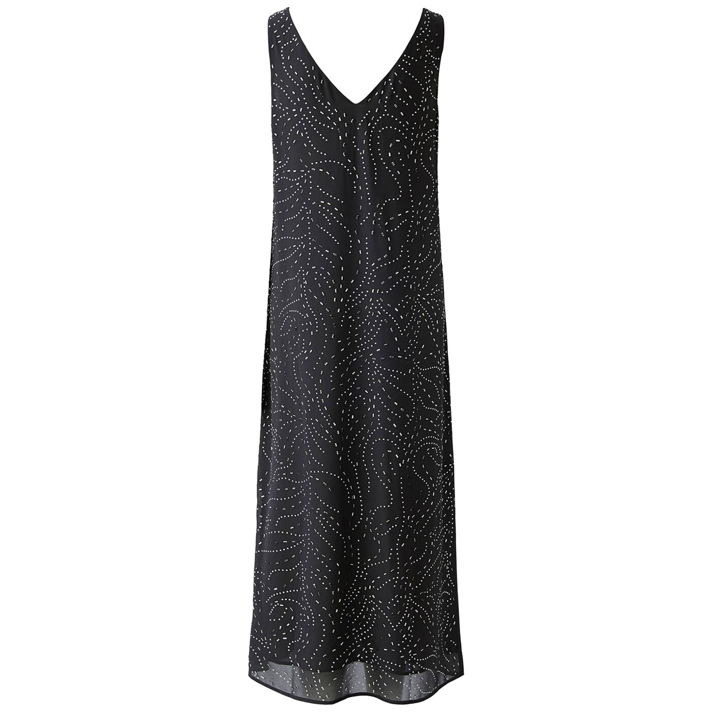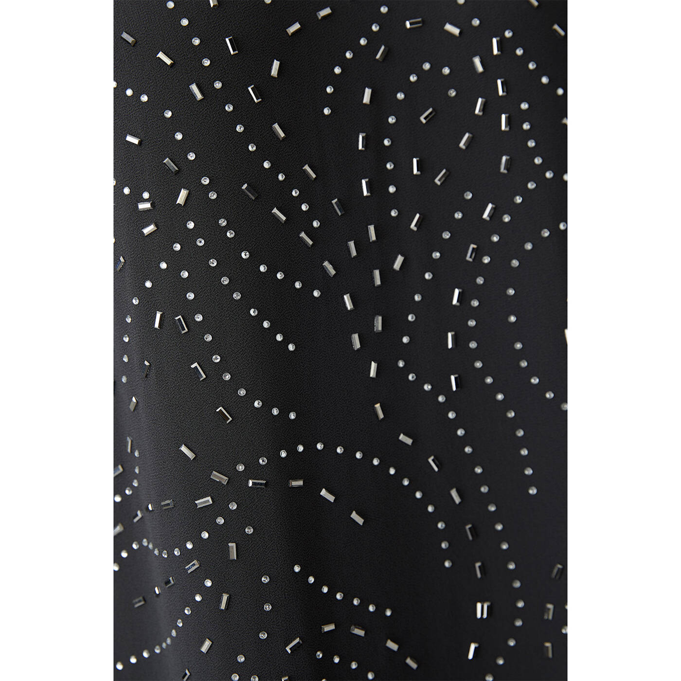 Pflegeleichter Polyestercrepe, zweilagig Lässig geschnitten, Midi-Länge Tiefer V-Ausschnitt beidseitig Dekoration mit runden und länglichen Steinchen Seitlich hohe Schlitze