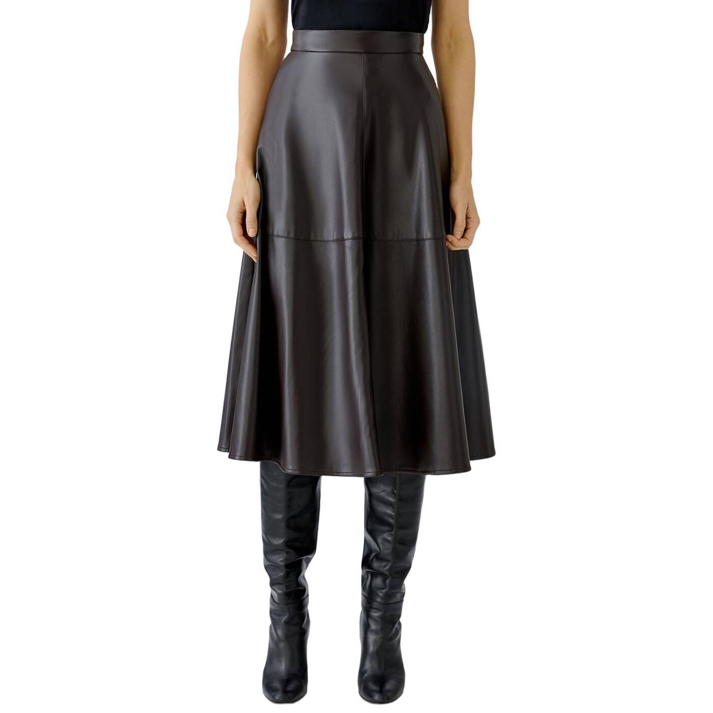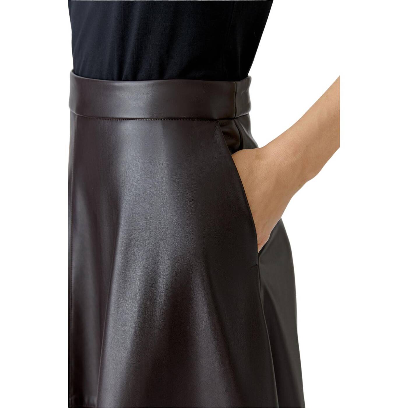 Supersoftes Material in Lederoptik, wertig gebondet mit einer kuschelig weich angerauten Innenseite A-Shape geschnitten, Midi-Länge Bund und nahtfeinem Reißverschluss in der hinteren Mitte Seitliche Eingrifftaschen Dekorative Nähte, wie sie bei Echtleder üblich sind
