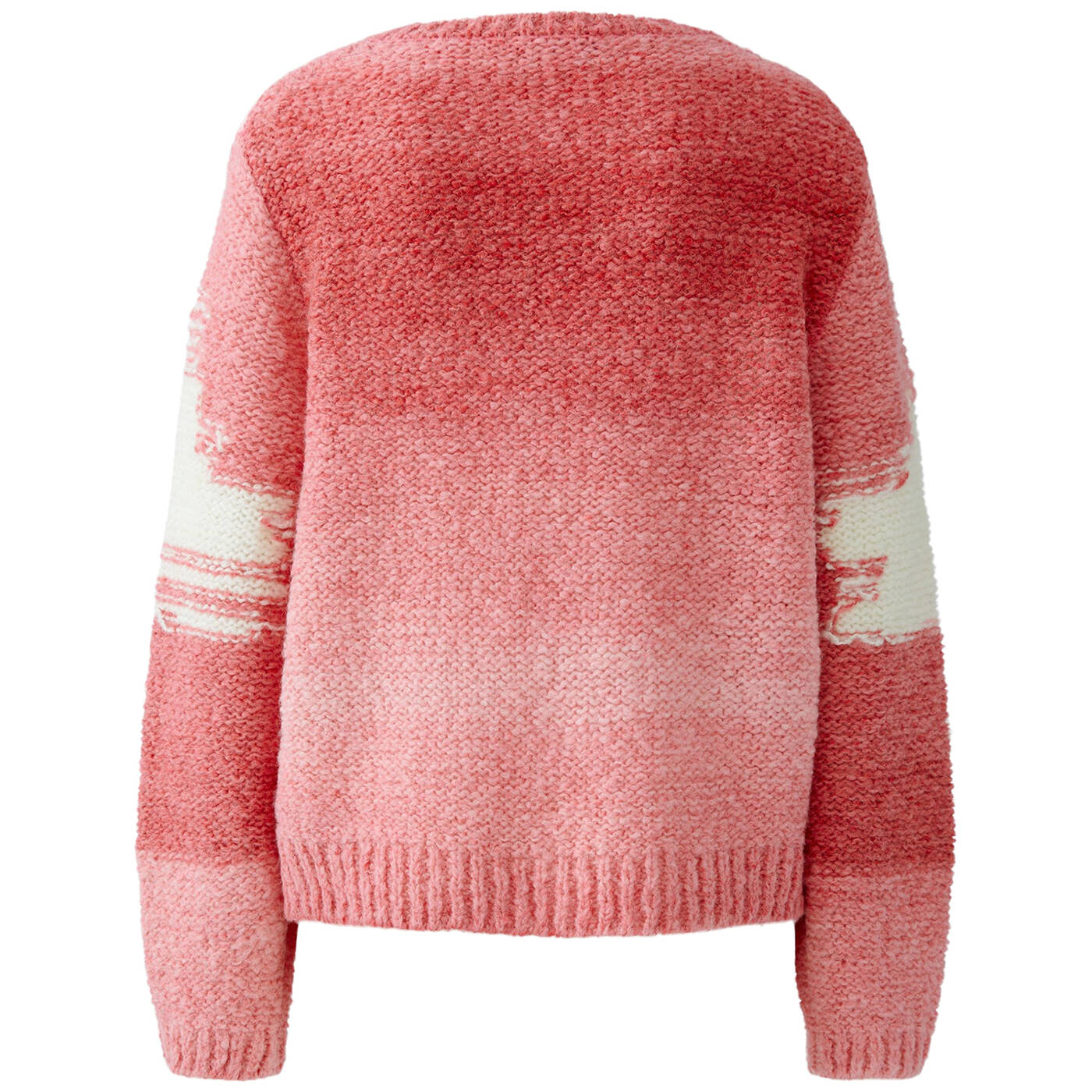 ANGEL Garn: super kuschlig mit Wolle und Mohair, links gestrickt mit Intarsien Lässig geschnitten, reguläre Länge Rundhals mit Blende Die Verknotungen der Farbübergänge sind bewusst nach außen gelegt Alle Strickbündchen sind mit Elasthan verstärkt