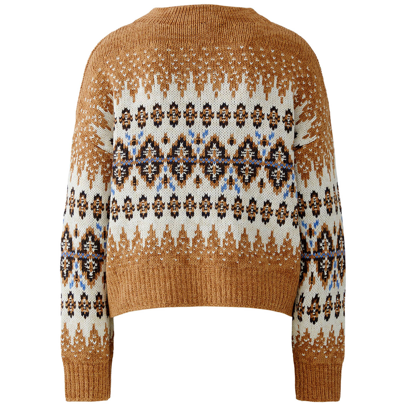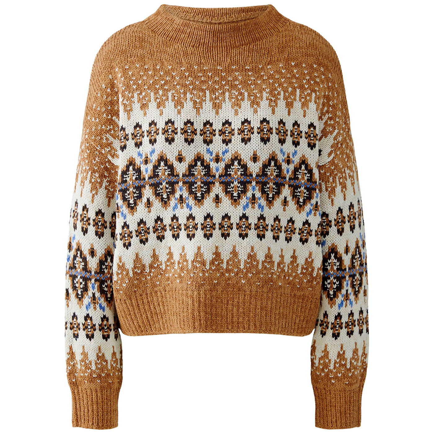 Baumwollmischung, Norwegermuster in Jacquard eingestrickt, mit Glanzgarn Lässig geschnitten, verkürzte Länge Angestrickter kurzer Stehkragen, umgeschlagen und fixiert Leicht überschnittene Schulter, Langarm Strickbündchen am Ärmel und Saum sind fester gestrickt