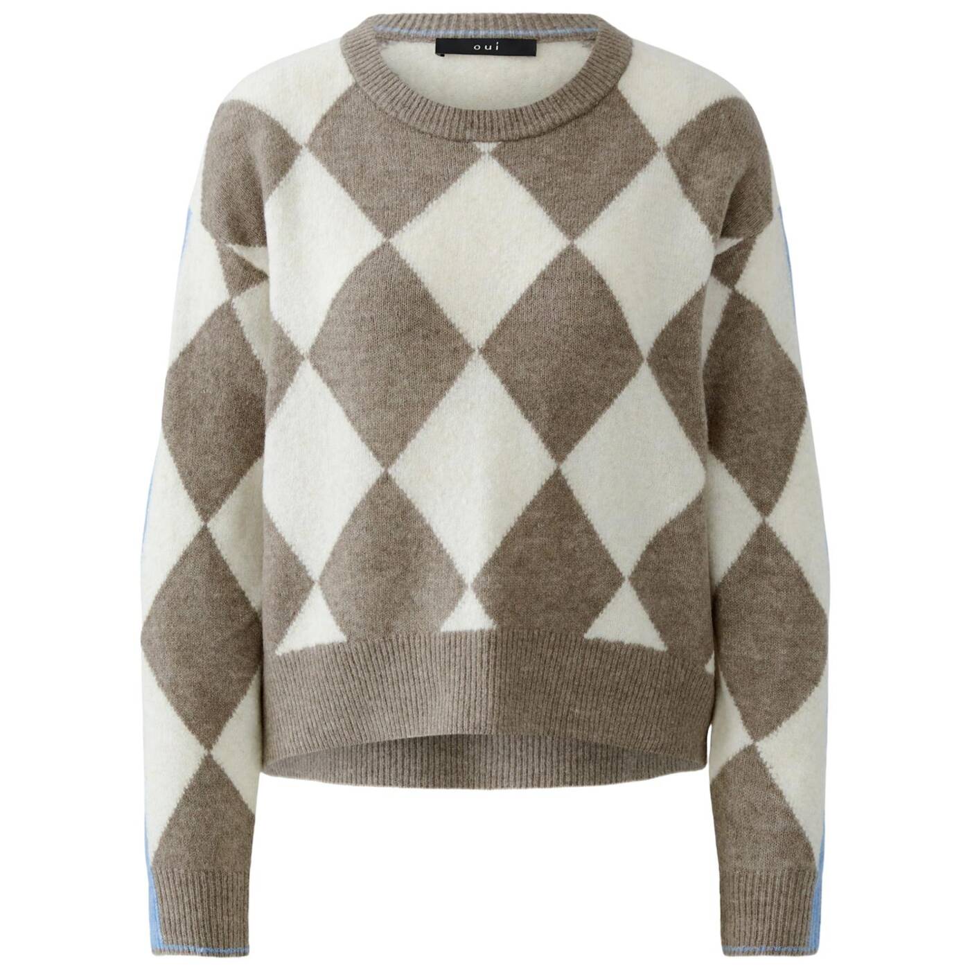 Glatt gestrickt mit Allover Rauten Lässig geschnitten, reguläre Länge Rundhals mit Strickbündchen Überschnittener Langarm mit Rippbündchen Kontraststreifen entlang der Ärmelfalte und -bündchen