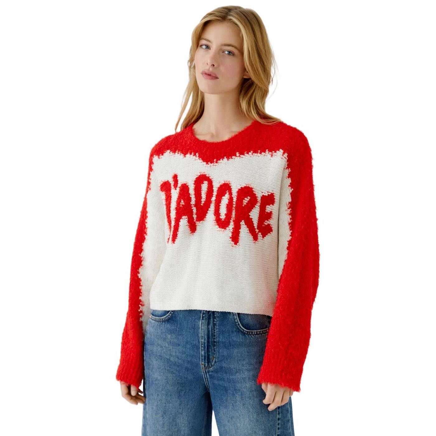 Cottonina mit kontrastfarbenem Einsatz aus Kuschelgarn quer gestrickt Oversized geschnitten, verkürzte Länge Rundhals mit Rippbündchen Fledermausärmel, kontrastfarbener Einsatz reicht bis zum Ärmelende Eingestrickte Intarsie