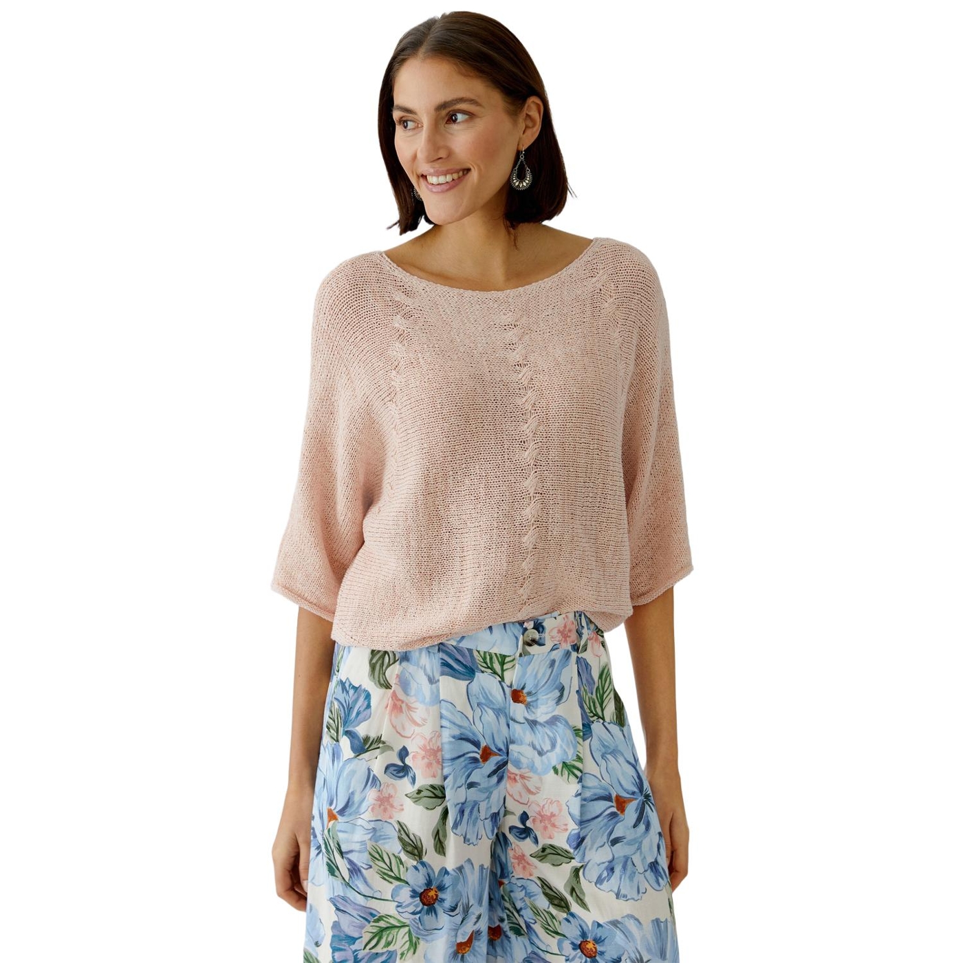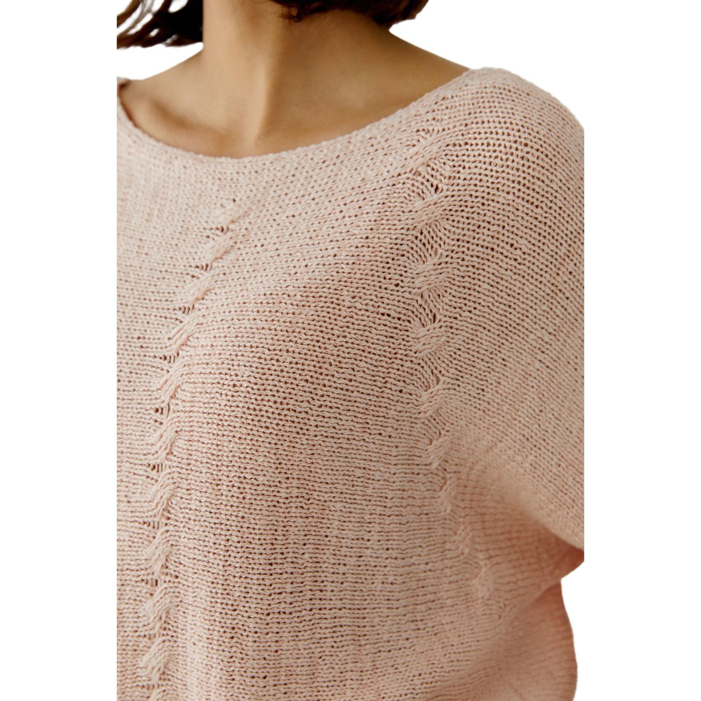 Bändchengarn in bewährter Baumwollmischung, glatt horizontal gestrickt Lässig geschnitten, verkürzte Länge Kragenloser U-Boot Ausschnitt Zopfdetail in angedeuteter Raglanlinie und als "Mittelnaht" Gerundete Saumlinie