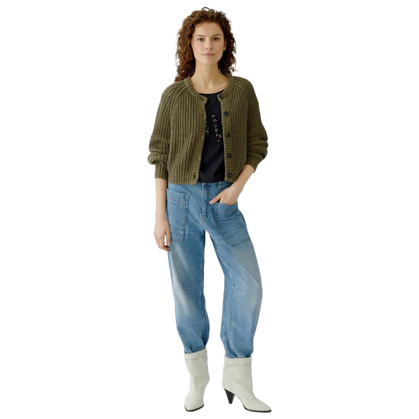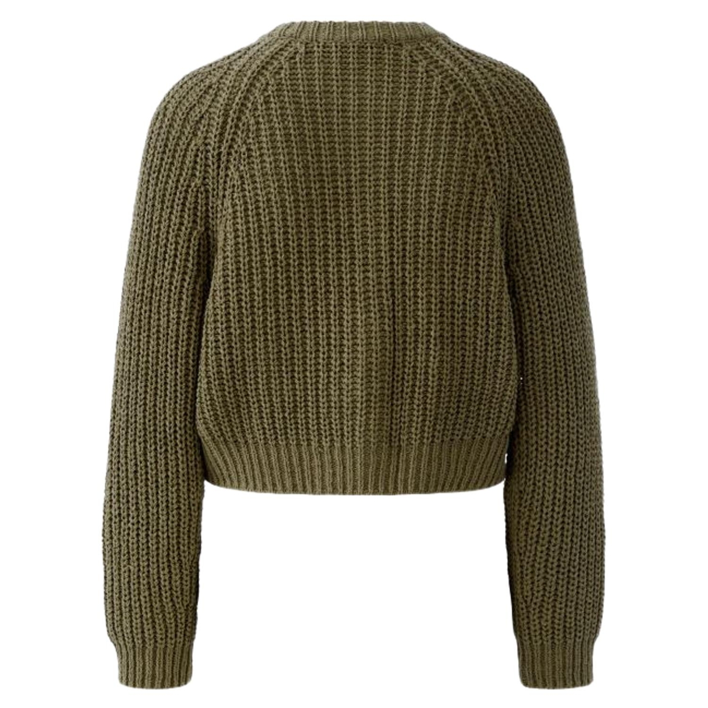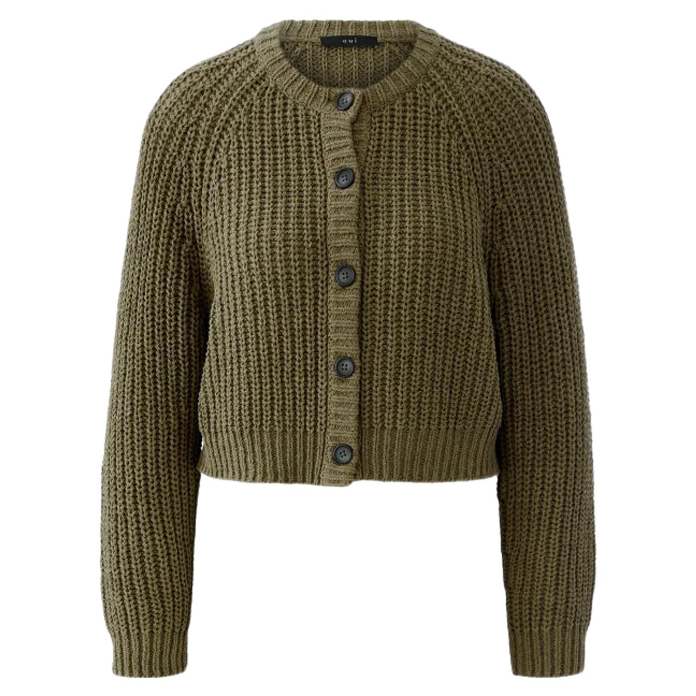 Bändchengarn in Rippe gestrickt Lässig geschnitten, verkürzte Länge Rundhals mit gedoppeltem Strickbündchen Langarm mit tief eingesetztem Raglan Durchgehende Knopfleiste mit wertigen Knöpfen in Hornoptik