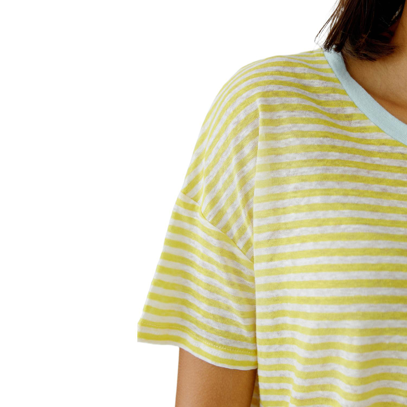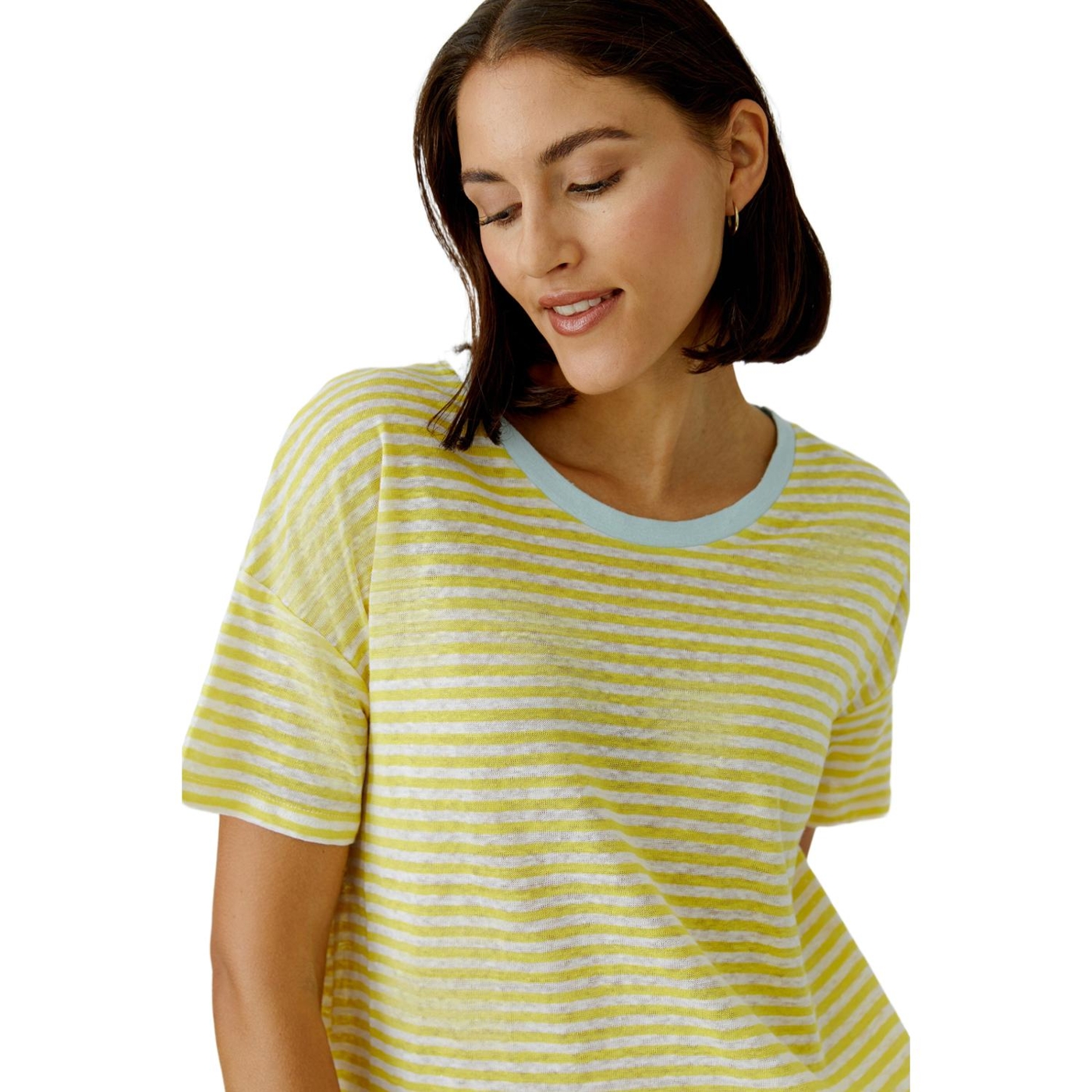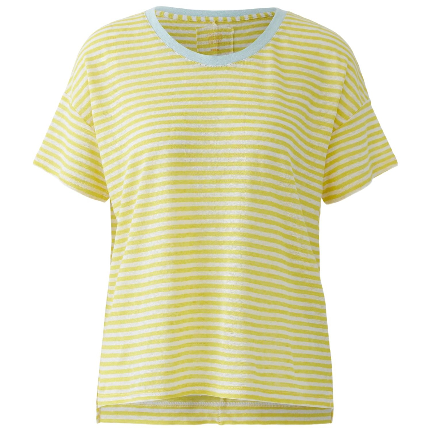 Jersey in 100% Leinen mit eingewirkten Streifen, besonders weich Boxy geschnitten, reguläre Länge, hinten verlängert Sommerlicher Rundhals mit kontrastfarbener Blende Stark überschnittene Schulter, fällt locker zum Kurzarm Schlitze in der Seitennaht
