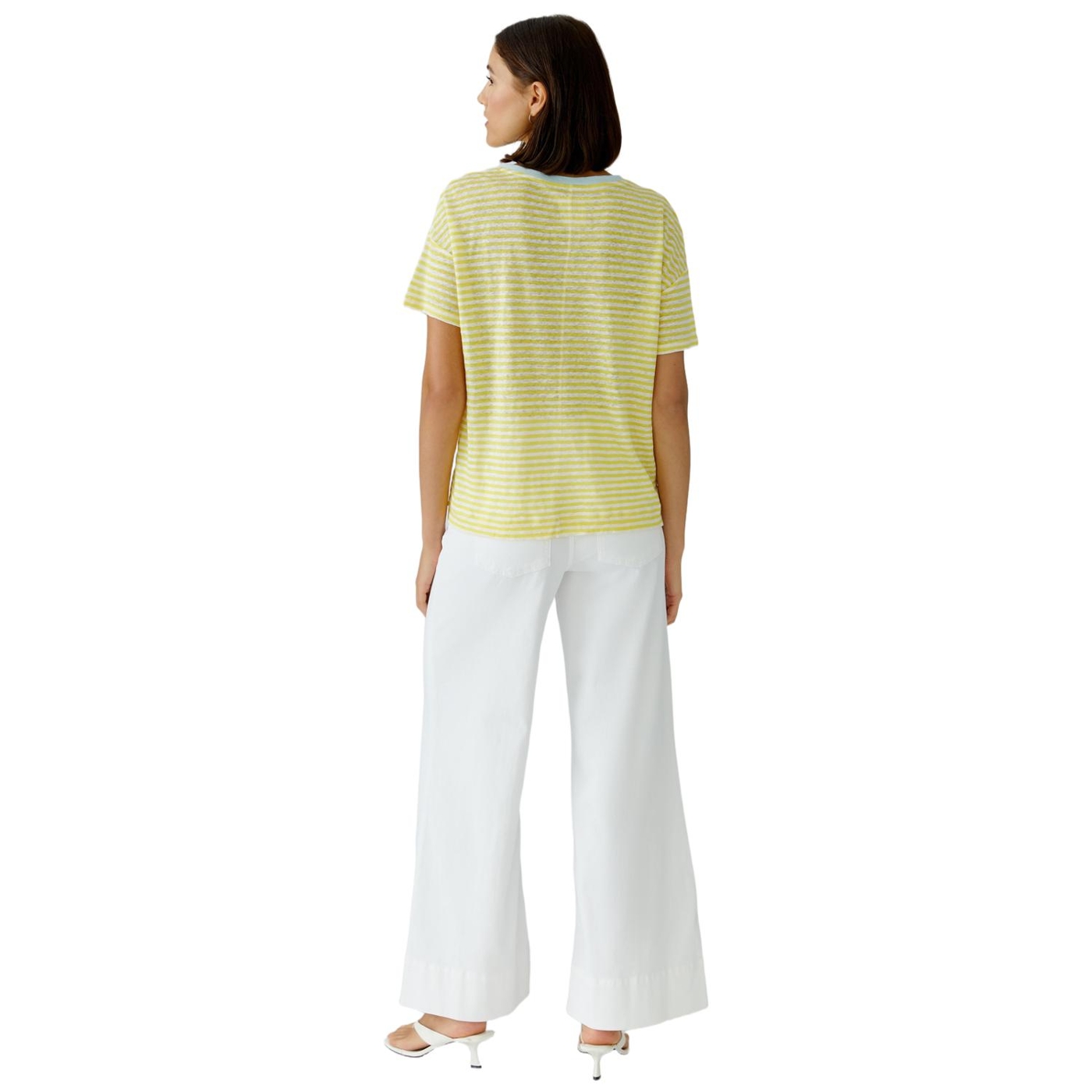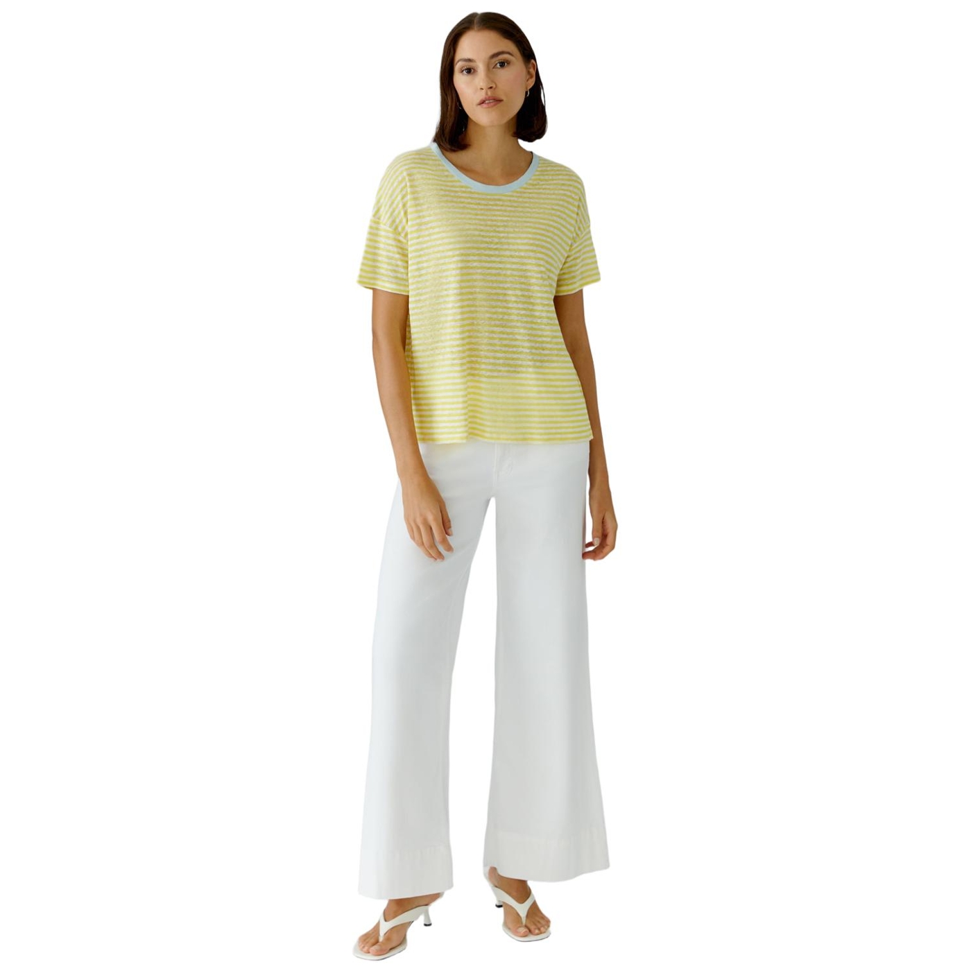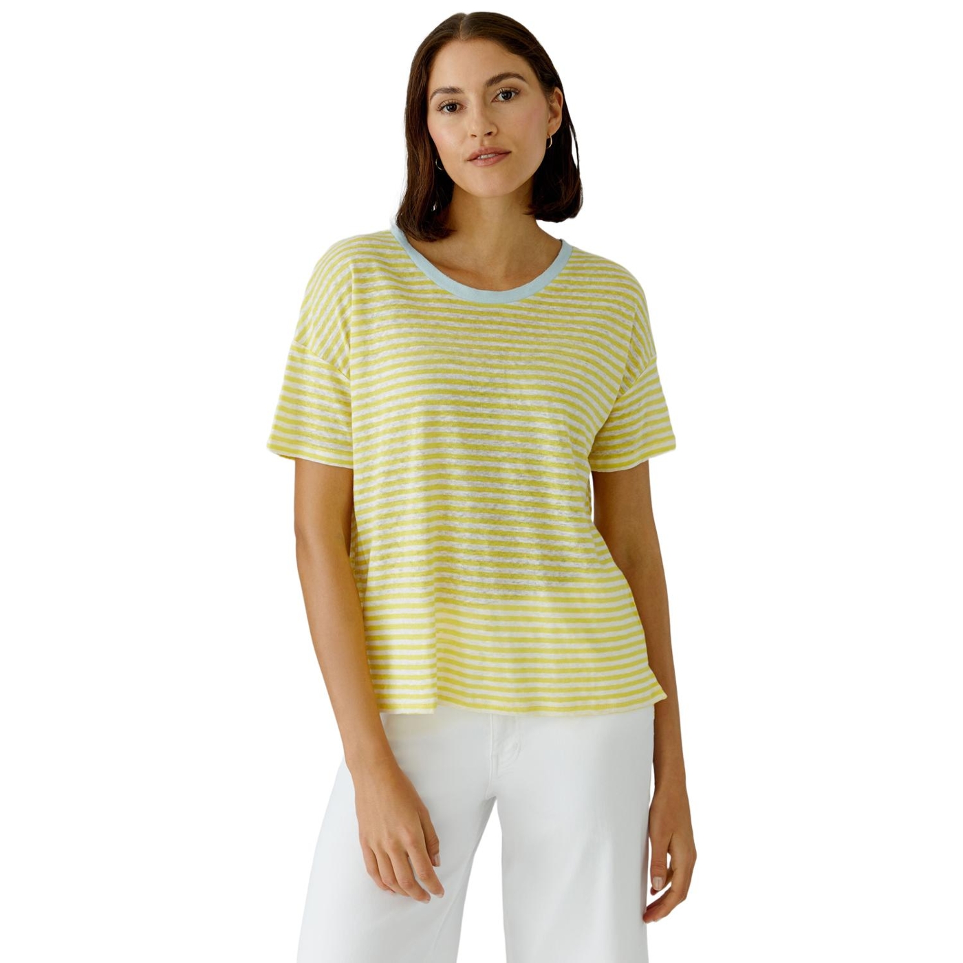 Jersey in 100% Leinen mit eingewirkten Streifen, besonders weich Boxy geschnitten, reguläre Länge, hinten verlängert Sommerlicher Rundhals mit kontrastfarbener Blende Stark überschnittene Schulter, fällt locker zum Kurzarm Schlitze in der Seitennaht