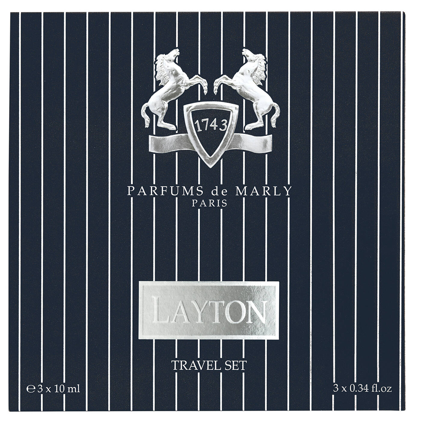 Es war das Ziel von Parfums de Marly, den idealen Begleiter für Reisen zu schaffen und ein elegantes und klassisches Reisespray zu entwickeln. Die elegante silberne Zamac-Hülle fasst eine 10-ml-Duftflasche und ist mit dem Logo von Parfums de Marly graviert. Das Layton Travel Set enthält insgesamt 30 ml und ist in drei Fläschchen à 10 ml aufgeteilt, zusammen mit dem eleganten Zamac-Sprühbehälter. Um den hochwertigen Sprühkoffer zu erhalten, bietet Parfums de Marly ein separates Refill-Set mit drei 10-ml-Duftfläschchen und einer separaten Pumpe an, mit denen der Kunde seinen Duft ändern und die Hülle wiederverwenden kann.