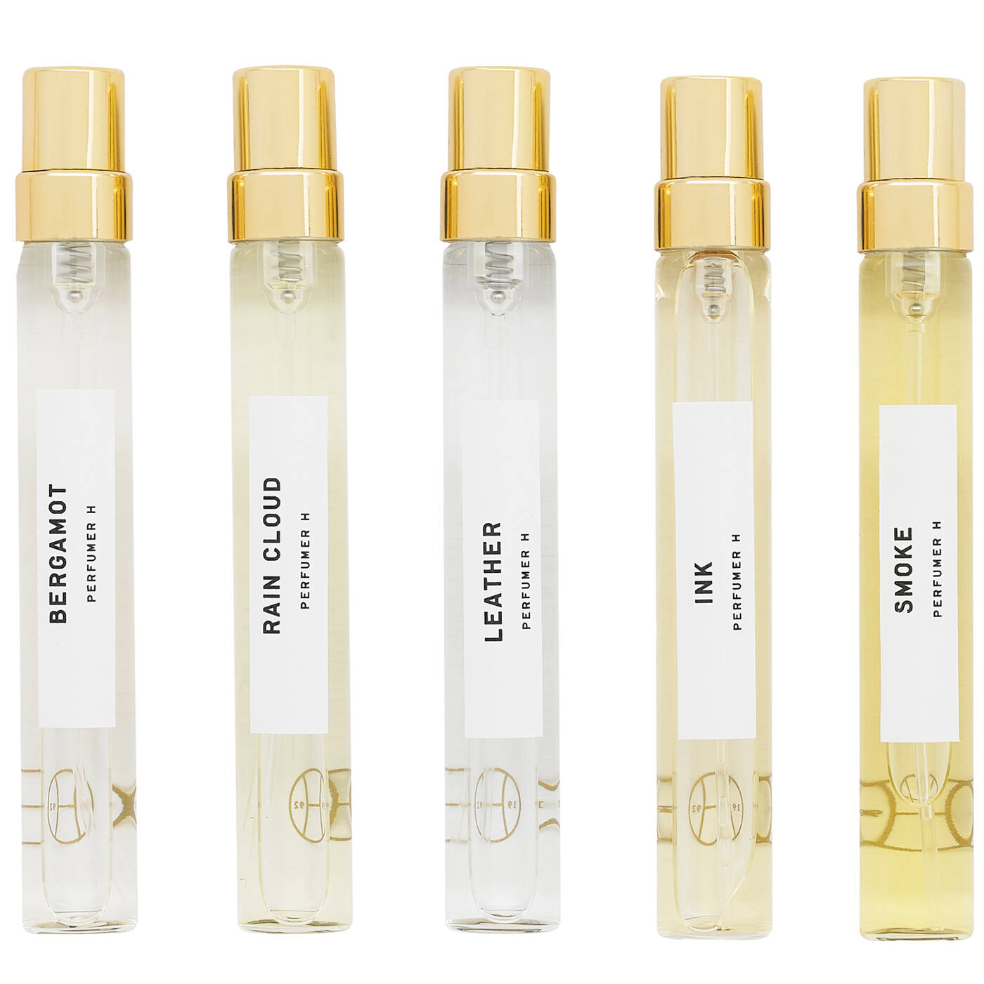 Die Icons Collection, ein Set unserer fünf klassischen Eau de Parfum (9 ml); Bergamotte, Regenwolke, Leder, Tinte und Rauch.