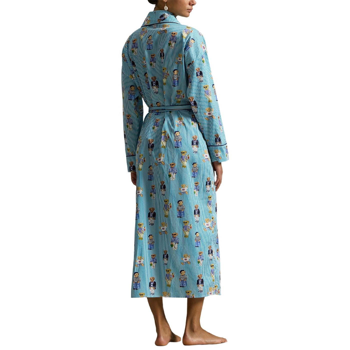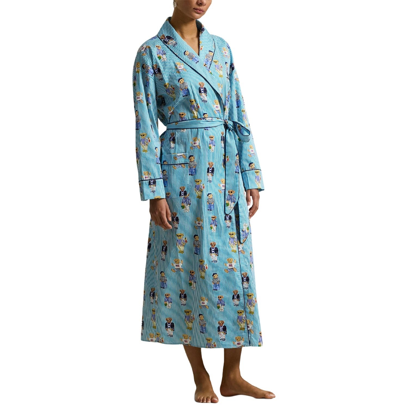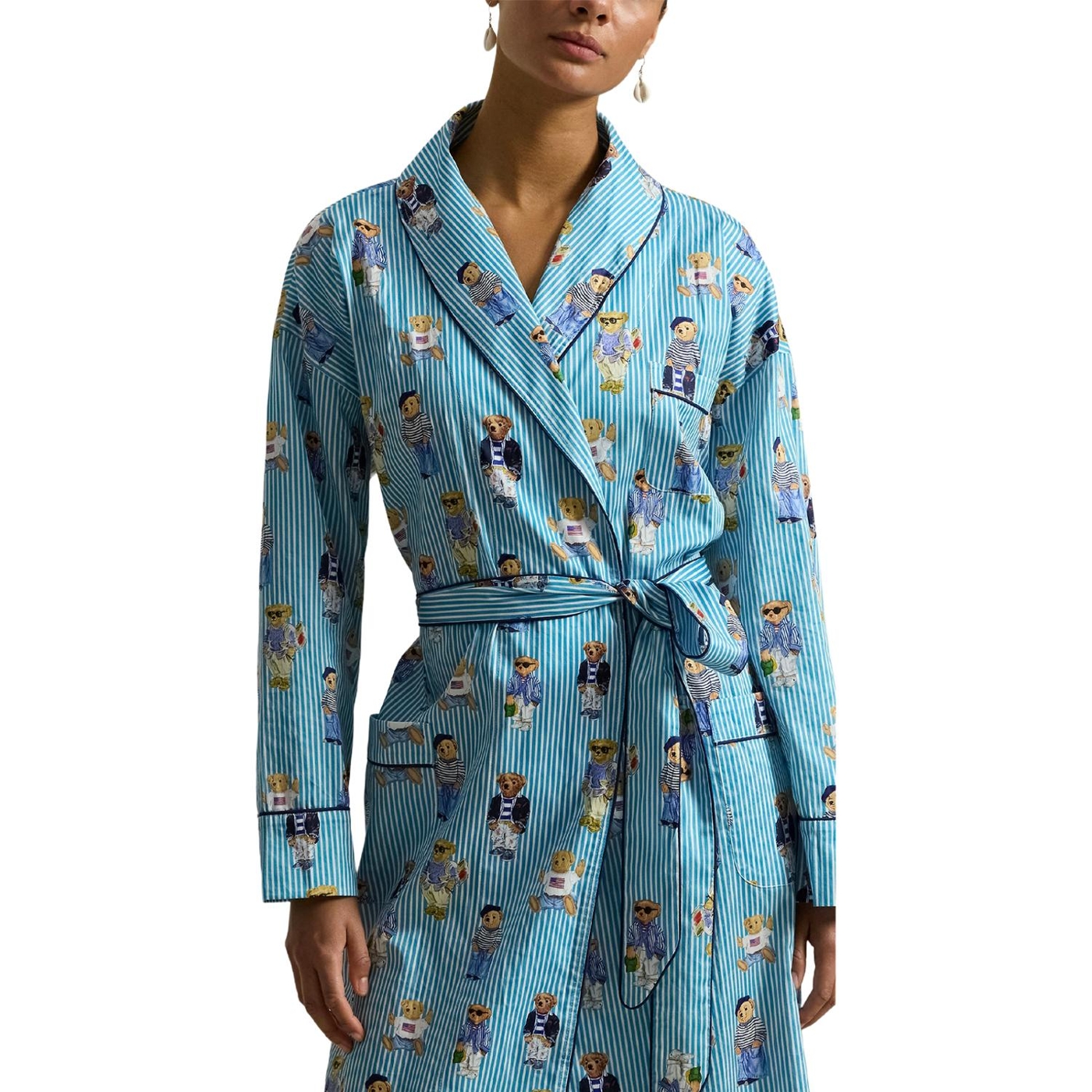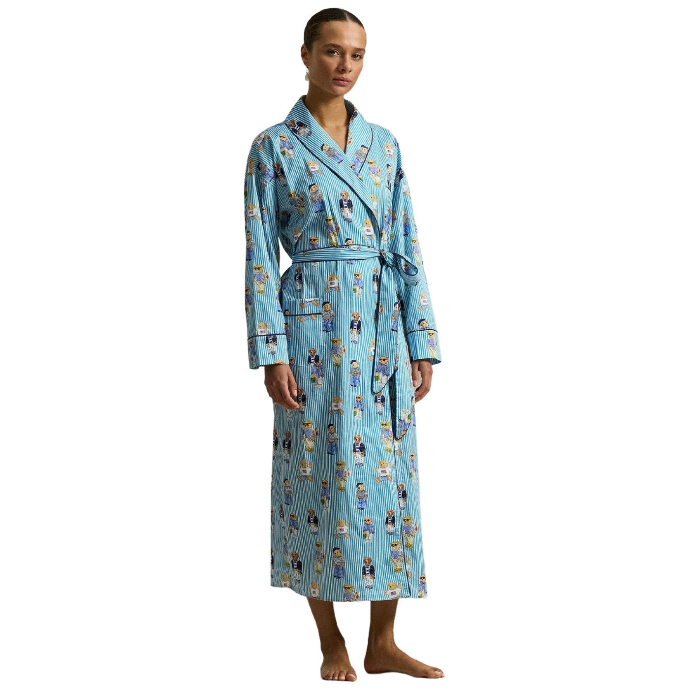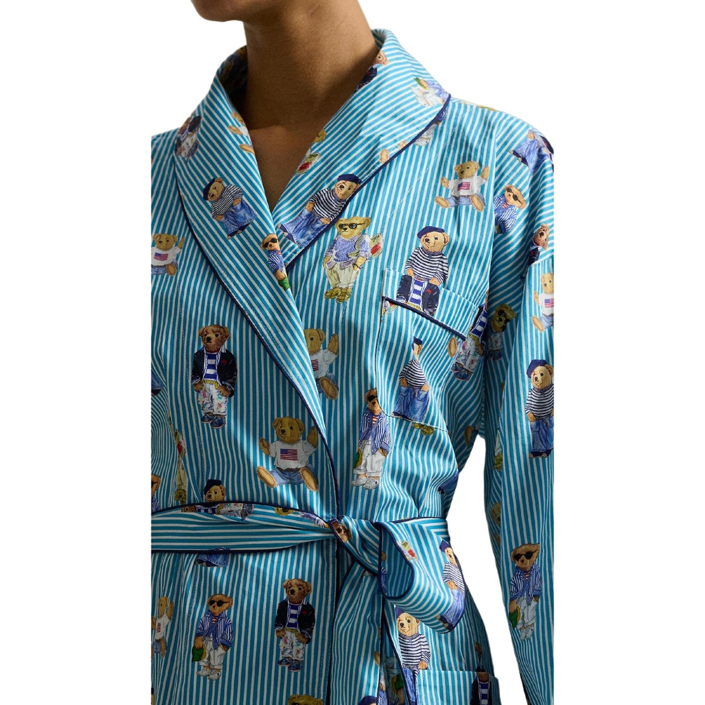 Ein verspieltes motiv mit dem polo-bären von ralph lauren ist auf diesen gestreiften morgenmantel aus baumwollsatin gedruckt, der sich weich anfühlt und mit klassischen paspelabschlüssen versehen ist.