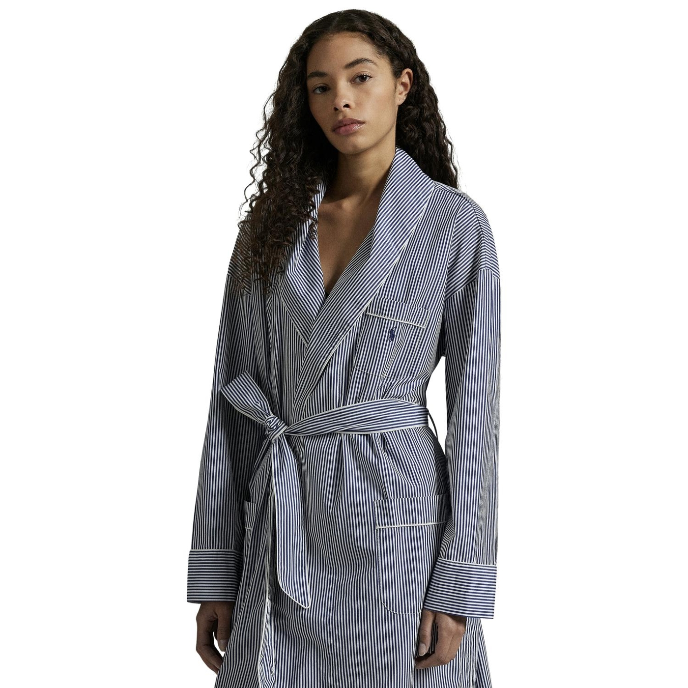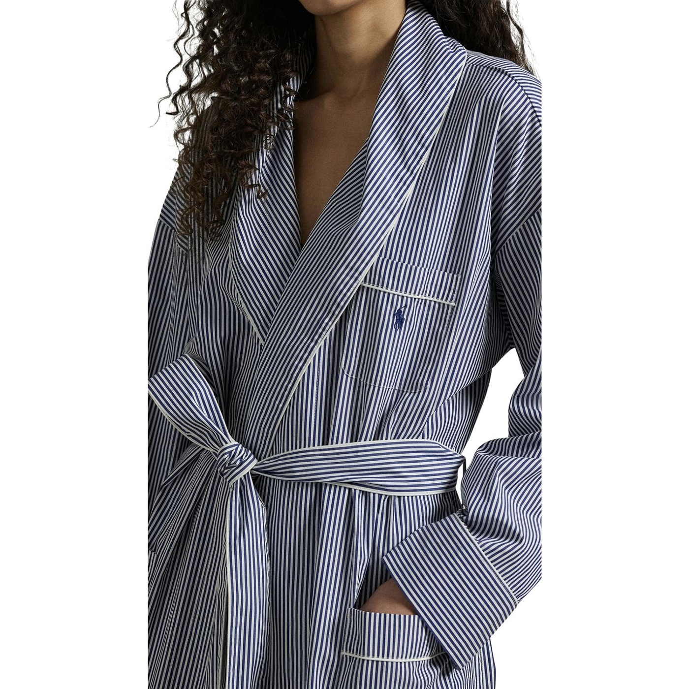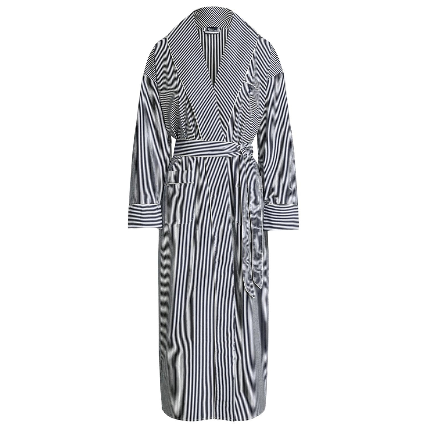 Dieser morgenmantel mit gürtel ist aus leichter baumwollpopeline gefertigt und hat ein klassisches streifenmotiv sowie eine ralph lauren pony-stickerei auf der brust, die für ein leichtes gewicht und einen weichen griff sorgt.