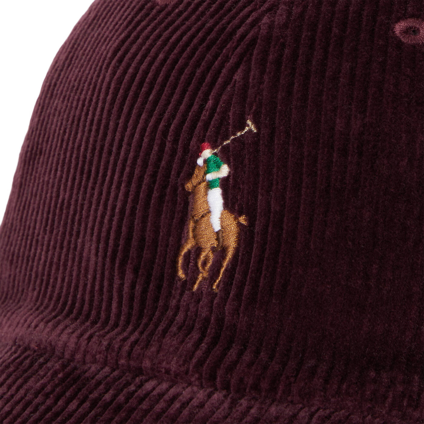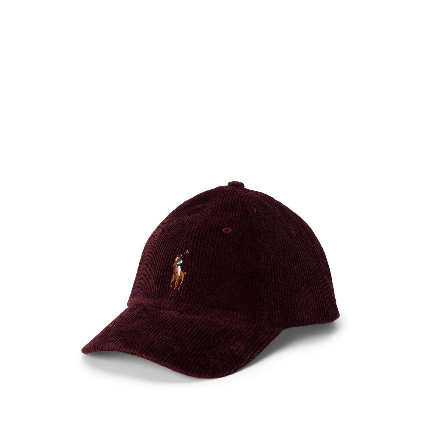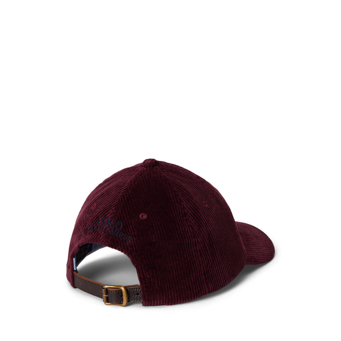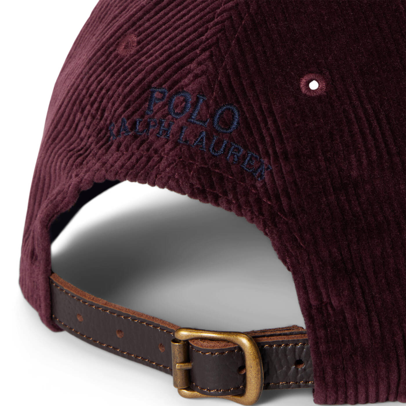 Diese Baseballkappe aus Kordsamt präsentiert sich mit Ralph Laurens mehrfarbigem, charakteristischem gesticktem Pony und einem Lederriemen mit Schnalle hinten.