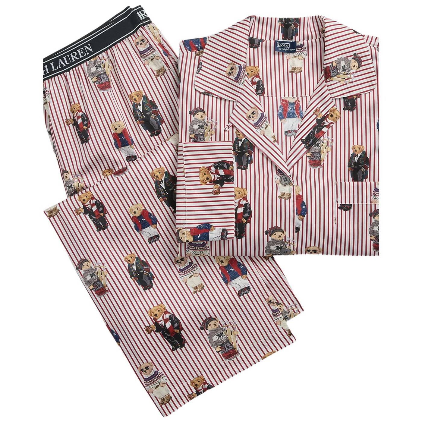 Der polo-bär von ralph lauren ist auf diesem gestreiften pyjama-set aufgedruckt, das aus einem langärmeligen hemd mit revers und einer langen hose besteht. unser charakteristischer logo-bund rundet den look ab.