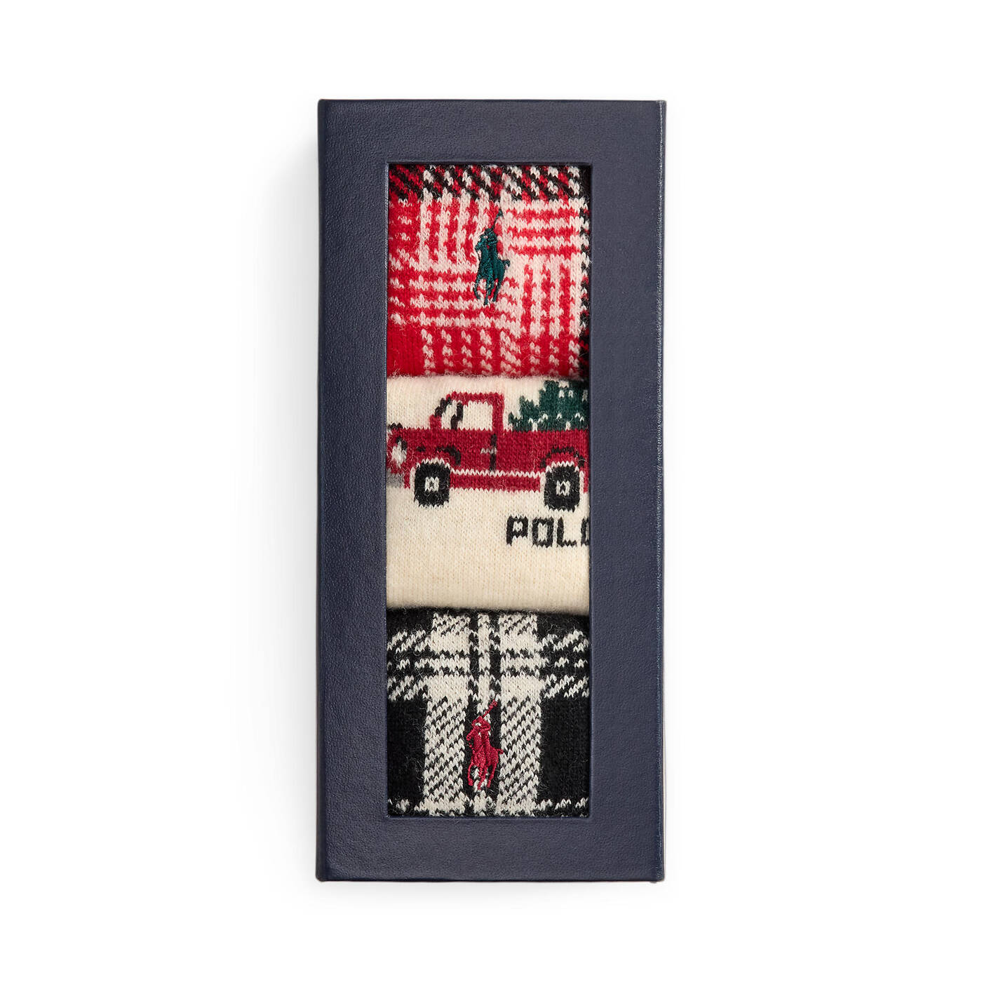 Ein Paar ist mit einem roten Lastwagen, der eine Kiefer transportiert, im Intarsien-Strick gestrickt, während zwei Paare mit Hemden-inspirierten Karomustern und charakteristischen gestickten Pony versehen sind.