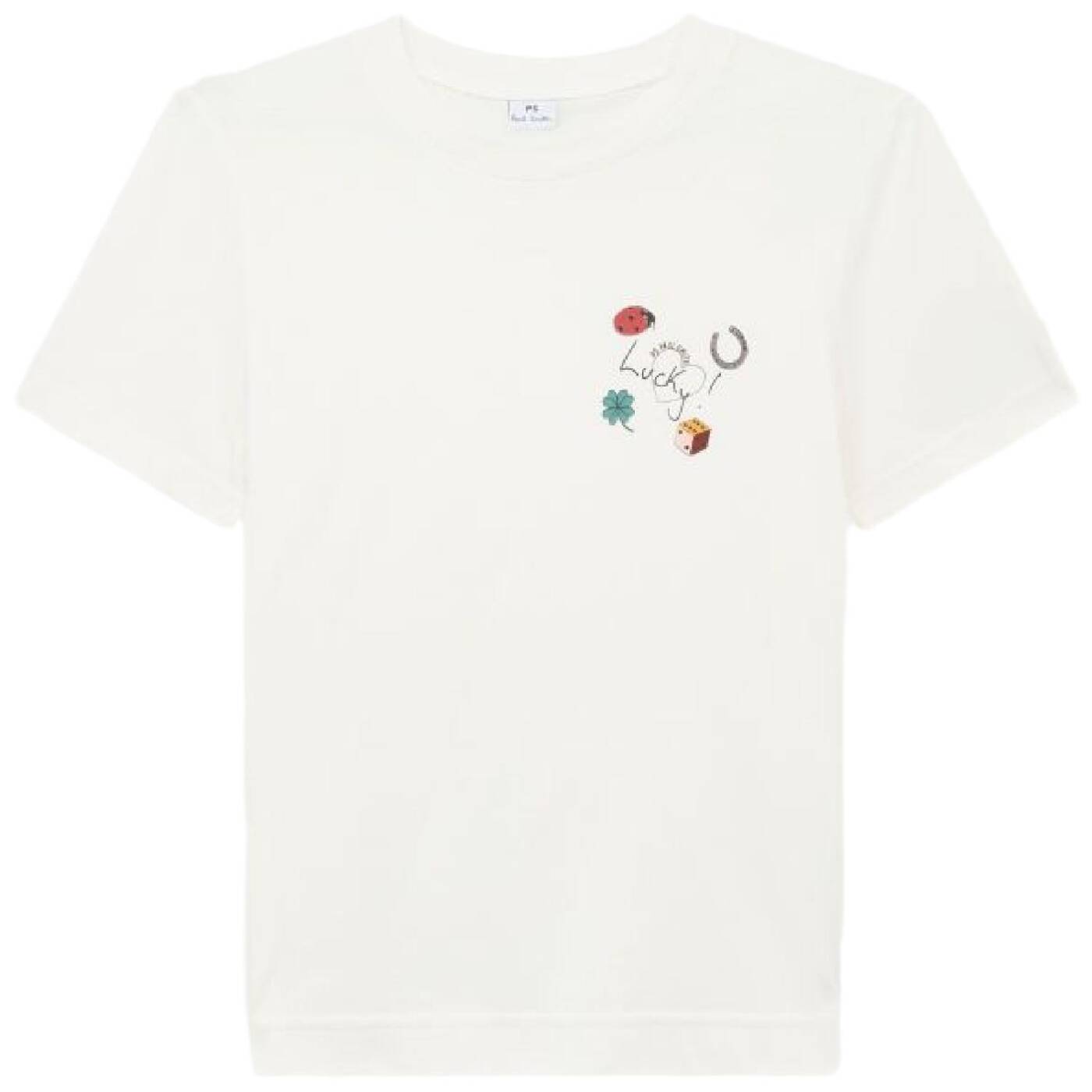 Lucky-Charms auf der linken Brustseite (Marienkäfer, Hufeisen, Kleeblatt, Würfel)