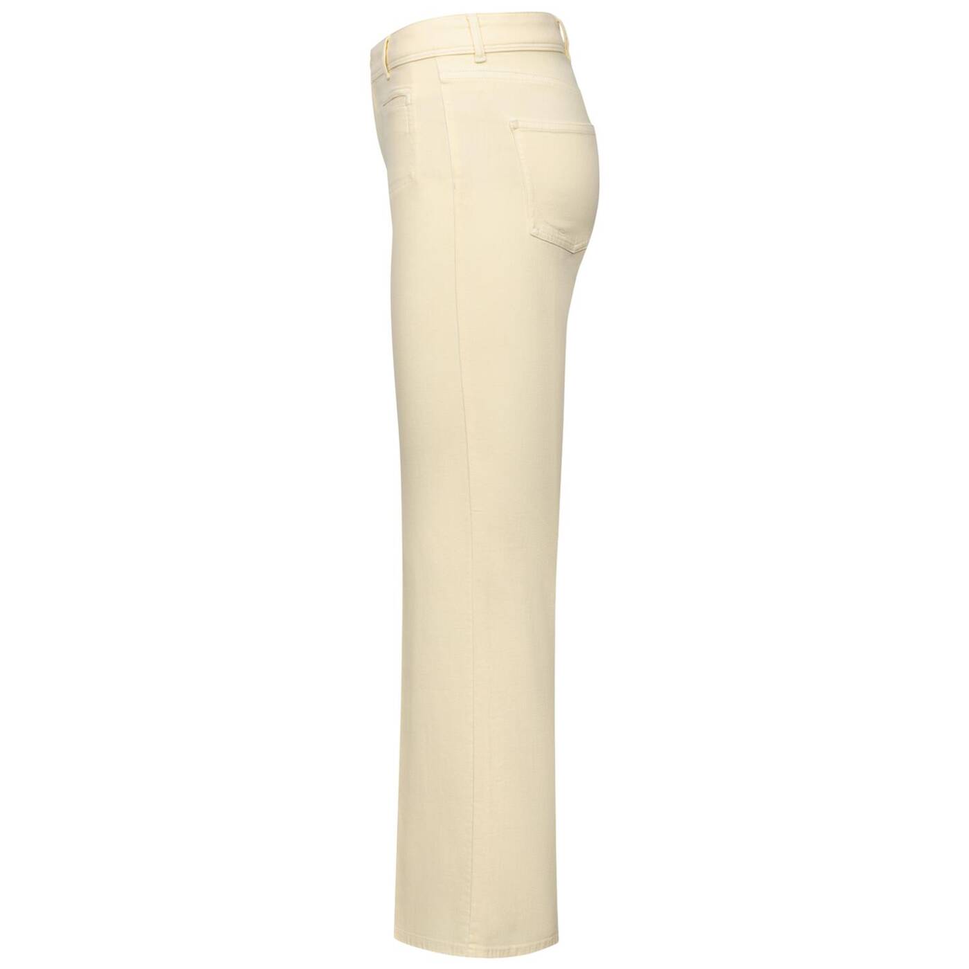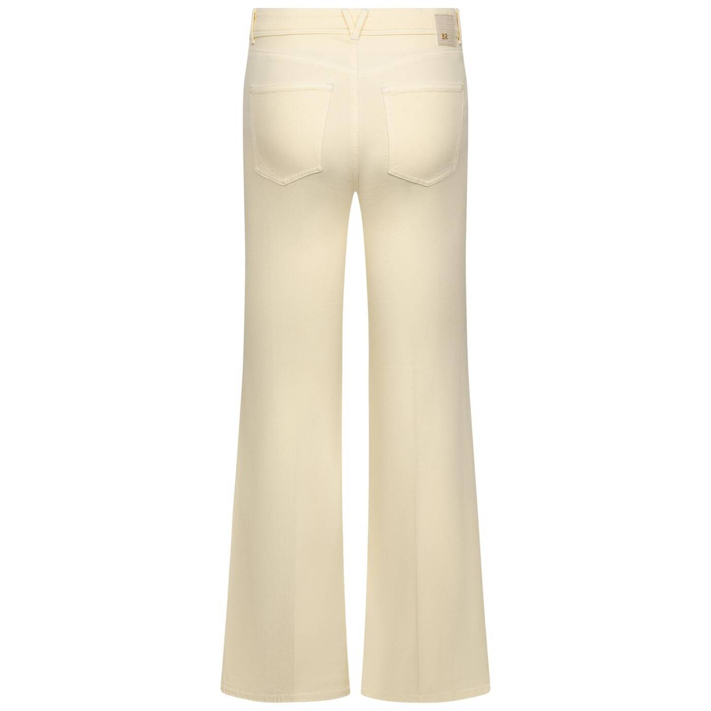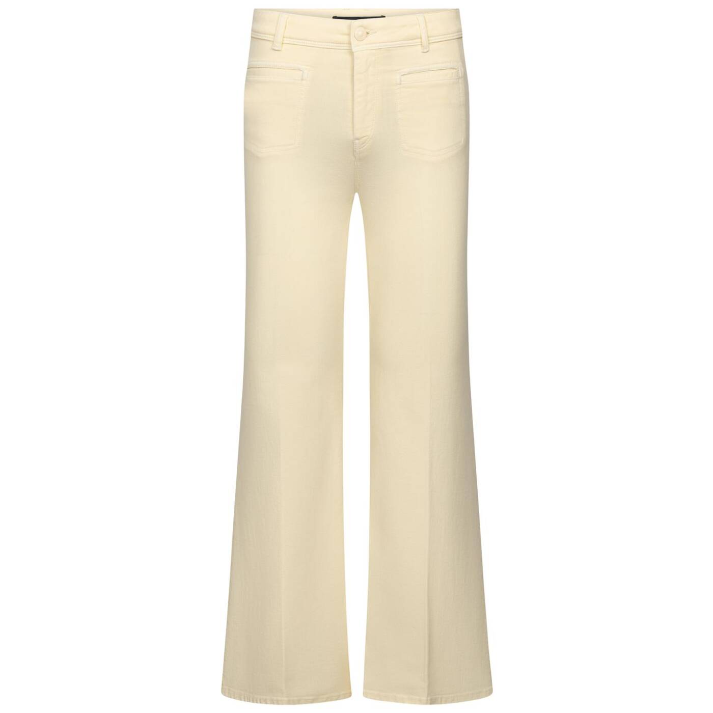 5-Pocket Style Mittlere Leibhöhe Ausgestelltes Bein Vorne Paspeltaschen mit Zierstepp Hinten aufgesetzte Taschen Artikel: White Denim Sommerlich leicht Dank Lyocell Anteil Besonders weich und fließend Leibhöhe: 25 cm Fußweite: 56 cm Schrittlänge: 83 cm