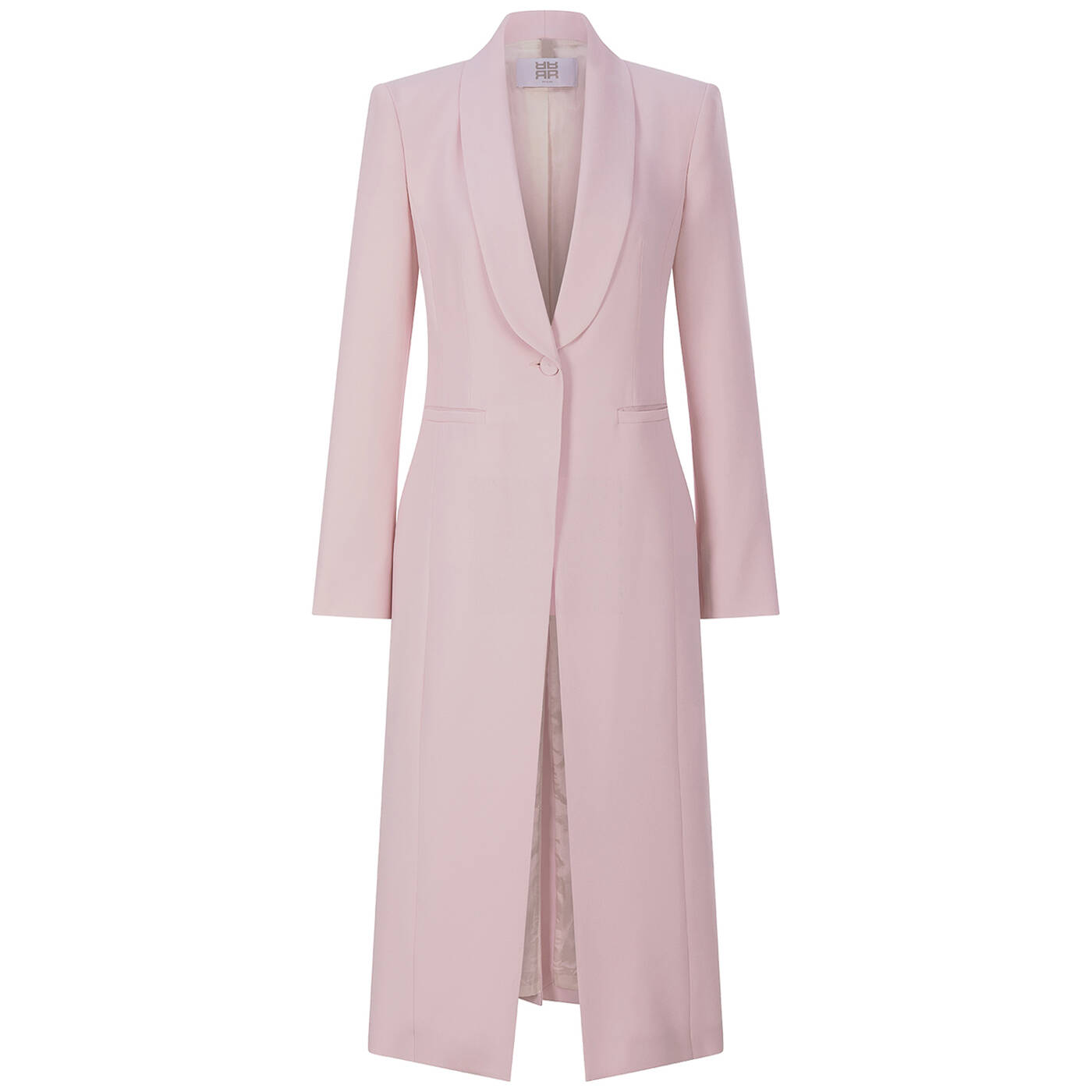 Dieser stilvolle Mantel aus hochwertigem Material strahlt Eleganz und Raffinesse aus. Mit einem eleganten Notch-Kragen, einer zentralen Knopfleiste und einem langen Schnitt fällt er sowohl im Büro als auch bei formellen Anlässen auf. Die sanfte Rosa-Farbe verleiht ihm einen femininen und modernen Touch.