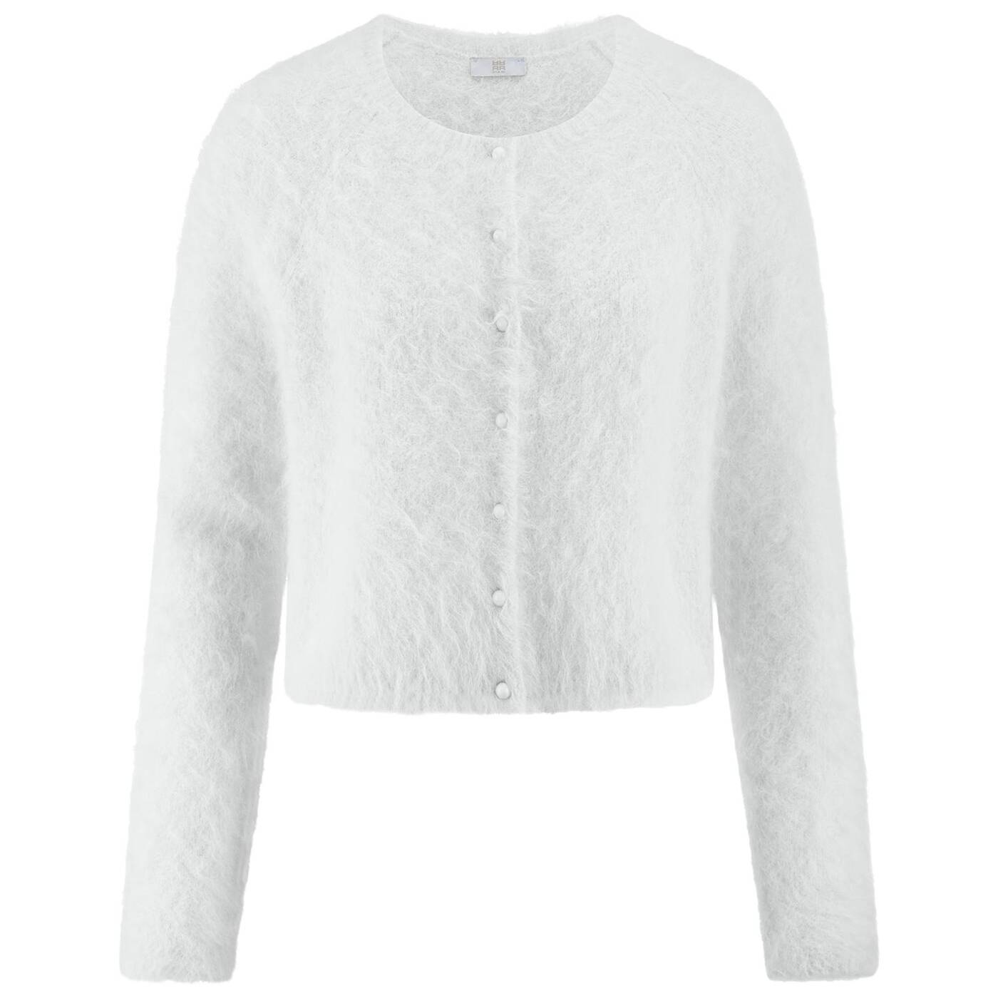 Stylish & cosy! Die Kurz Geschnittene Strickjacke von RIANI ist ein eleganter Allrounder für jeden Look. Dank des hohen Alpaka- Anteils erhält das Strickstück eine pelzähnliche, weiche Oberfläche, die besonders angenehm auf der Haut liegt und jeden Look aufwertet. Ob lässig zu Jeans, chic über Kleidern oder als stylischer Kontrast zu High-Waist-Hosen.