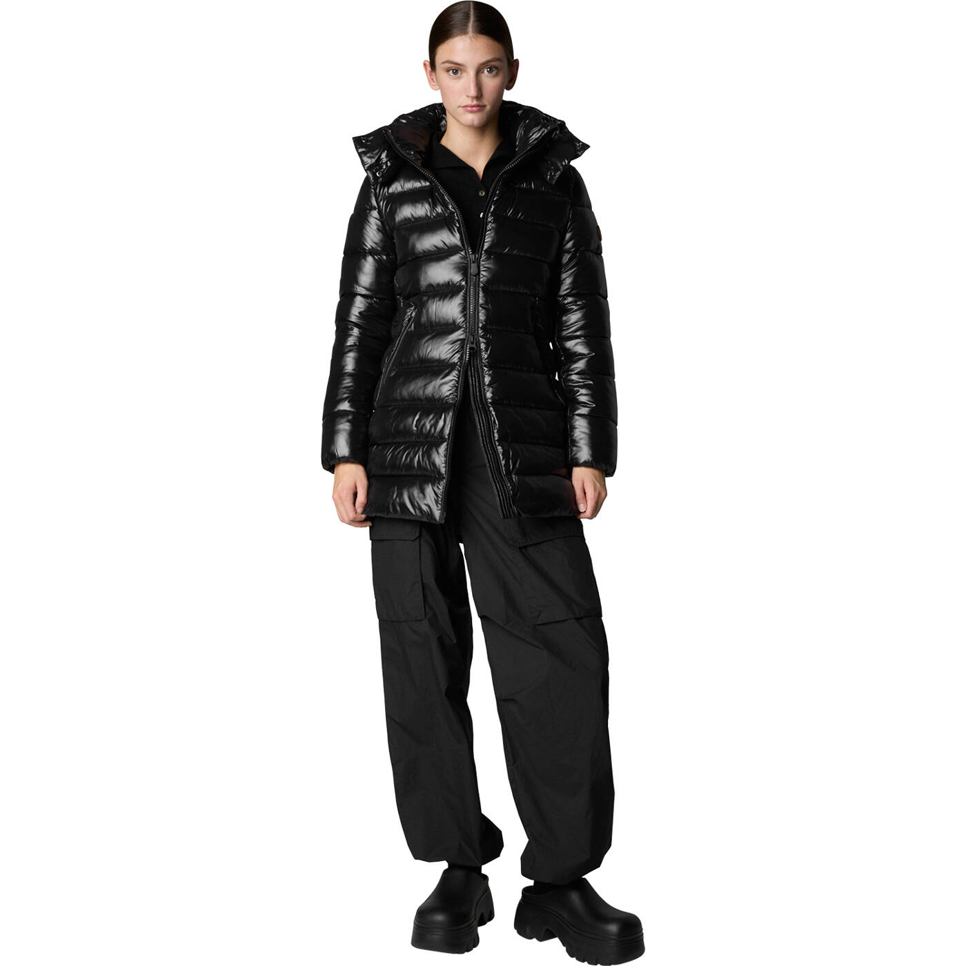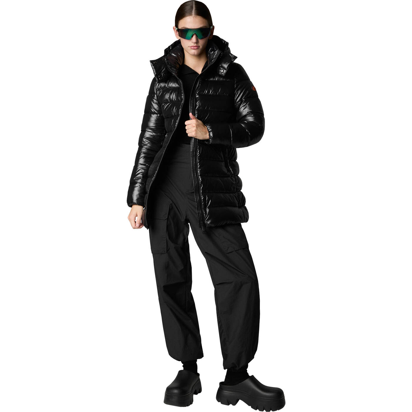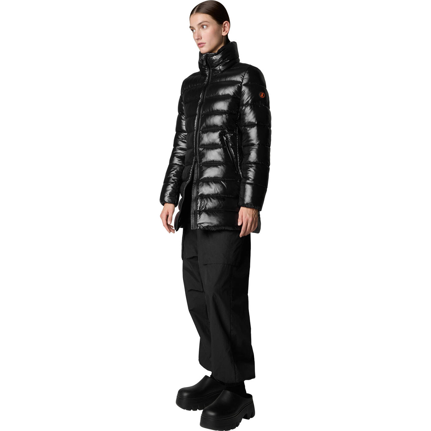 Der mittellange Mantel Marjorie verbindet Stil und Gemütlichkeit und ist aus lackiertem Nylongewebe mit schwarzen Akzenten gefertigt. Er weist eine hochabschließende Silhouette auf, verfügt über eine abnehmbare Kapuze und Reißverschlusstaschen. Zu den markanten Details gehören ein personalisierter Reißverschlussschieber sowie ein rundes Logo auf dem Ärmel.