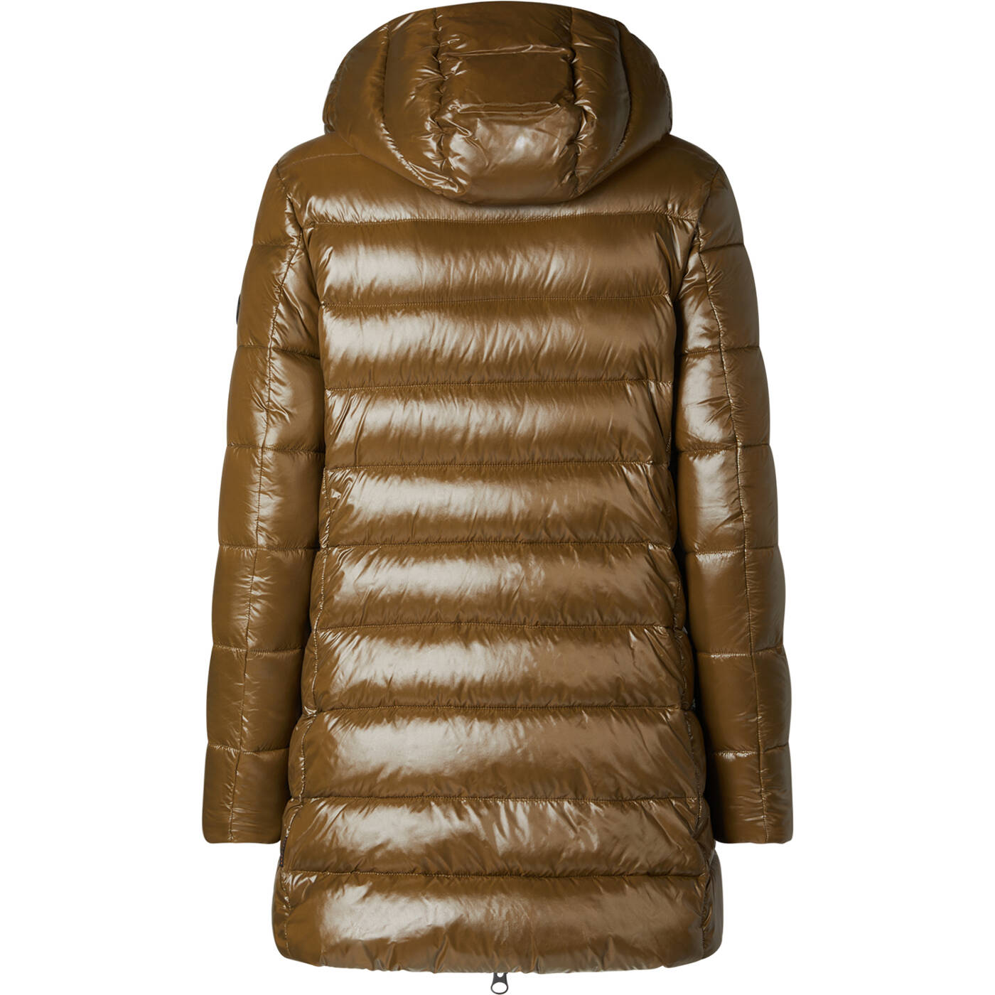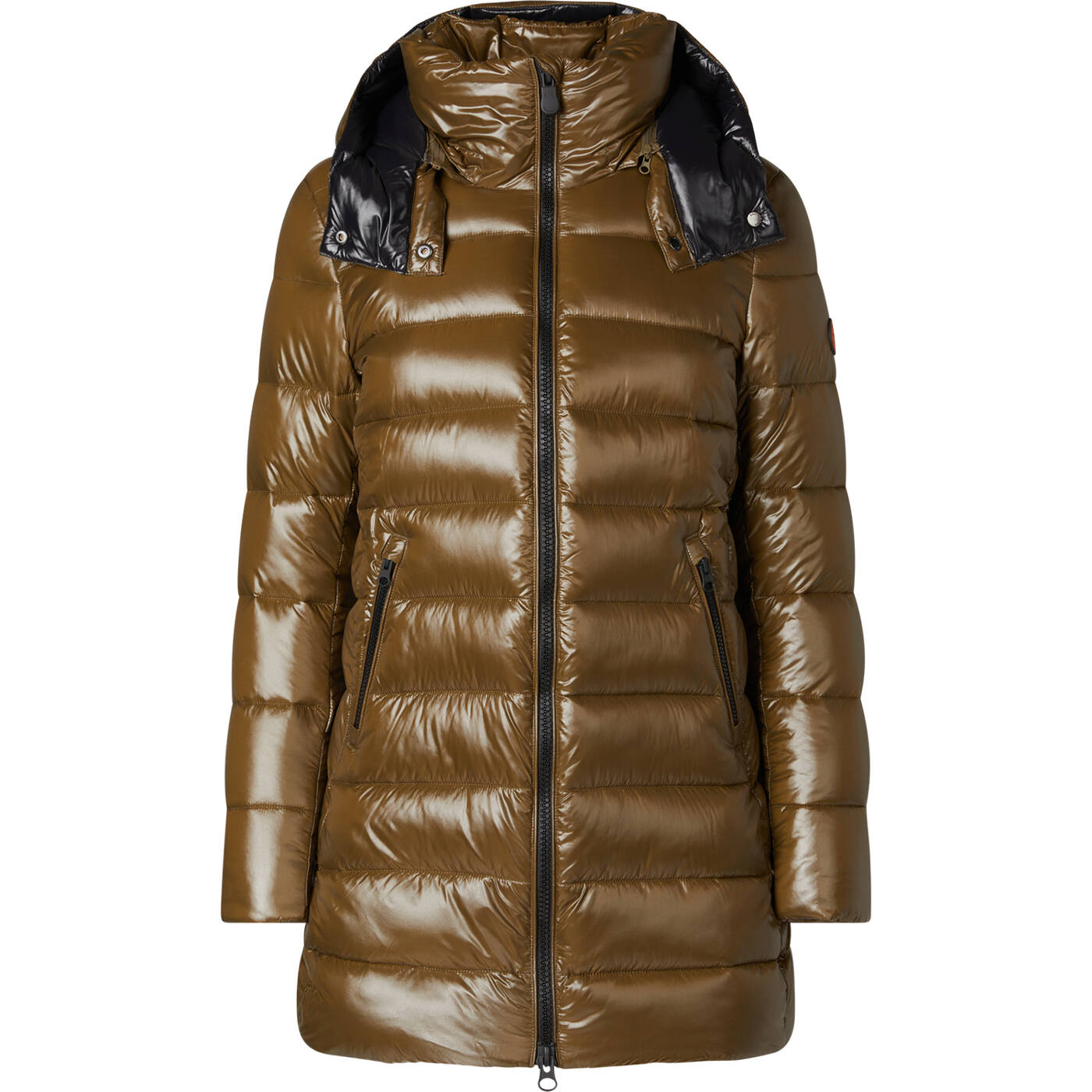 Der mittellange Mantel Marjorie verbindet Stil und Gemütlichkeit und ist aus lackiertem Nylongewebe mit schwarzen Akzenten gefertigt. Er weist eine hochabschließende Silhouette auf, verfügt über eine abnehmbare Kapuze und Reißverschlusstaschen. Zu den markanten Details gehören ein personalisierter Reißverschlussschieber sowie ein rundes Logo auf dem Ärmel.