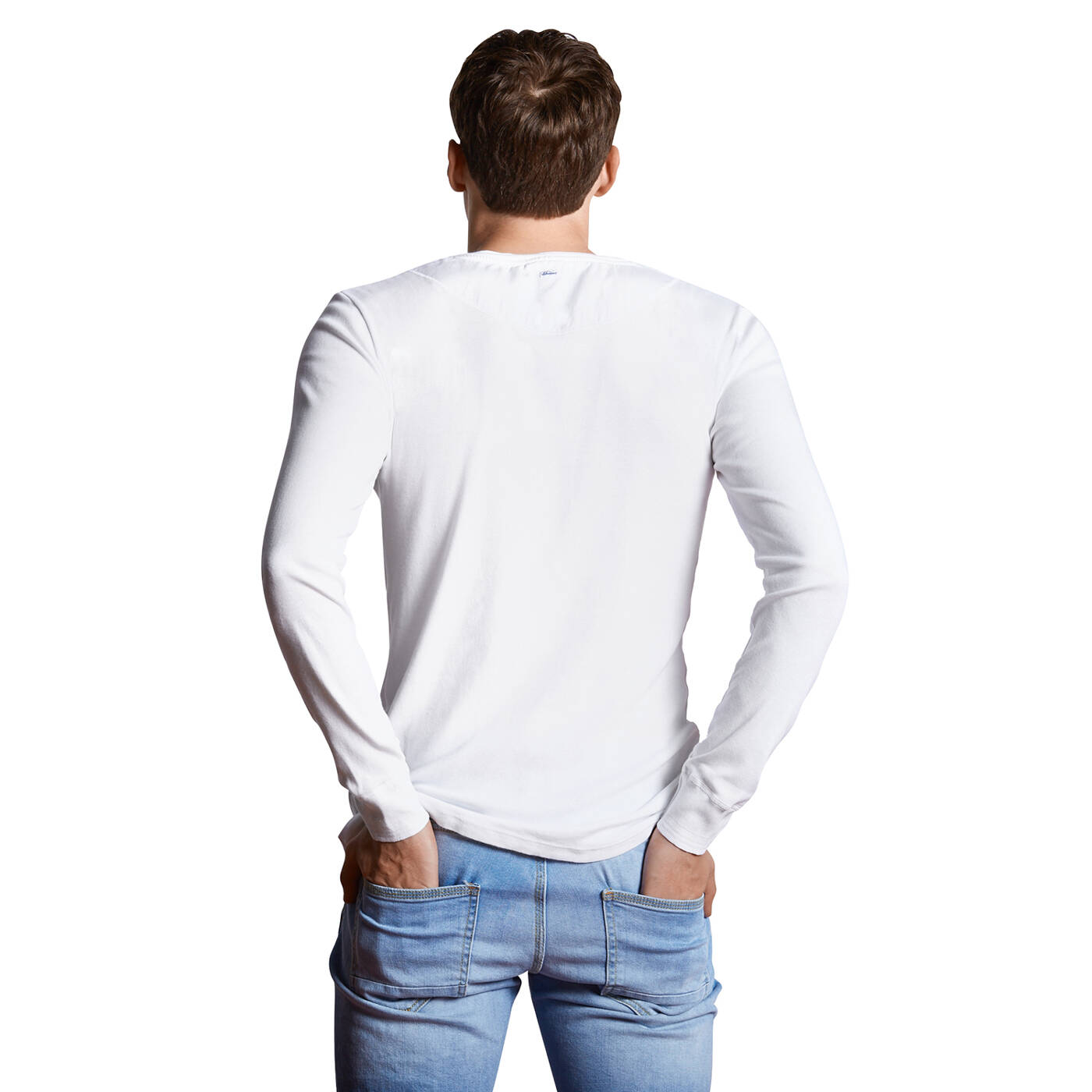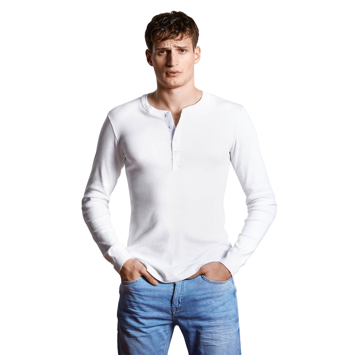 Ich bin's, Karl-Heinz. Du kennst mich bestimmt schon, ich bin der Kultklassiker von 1923, verkörpere beste Handwerkskunst und feinste Qualität im zeitgemäßen Look. Mit mir entscheidest du dich für ein Langarmshirt aus stückgefärbtem Feinripp, aus 100 % supergekämmter Bio-Baumwolle. Akzente setzen meine blauen Streifen, Perlmuttknöpfe und die traditionellen Flachränder als Armabschlüsse. Du siehst also: Ich bin nicht irgendwer, ich bin das Original unter den Originalen.