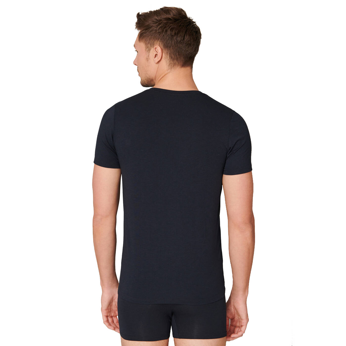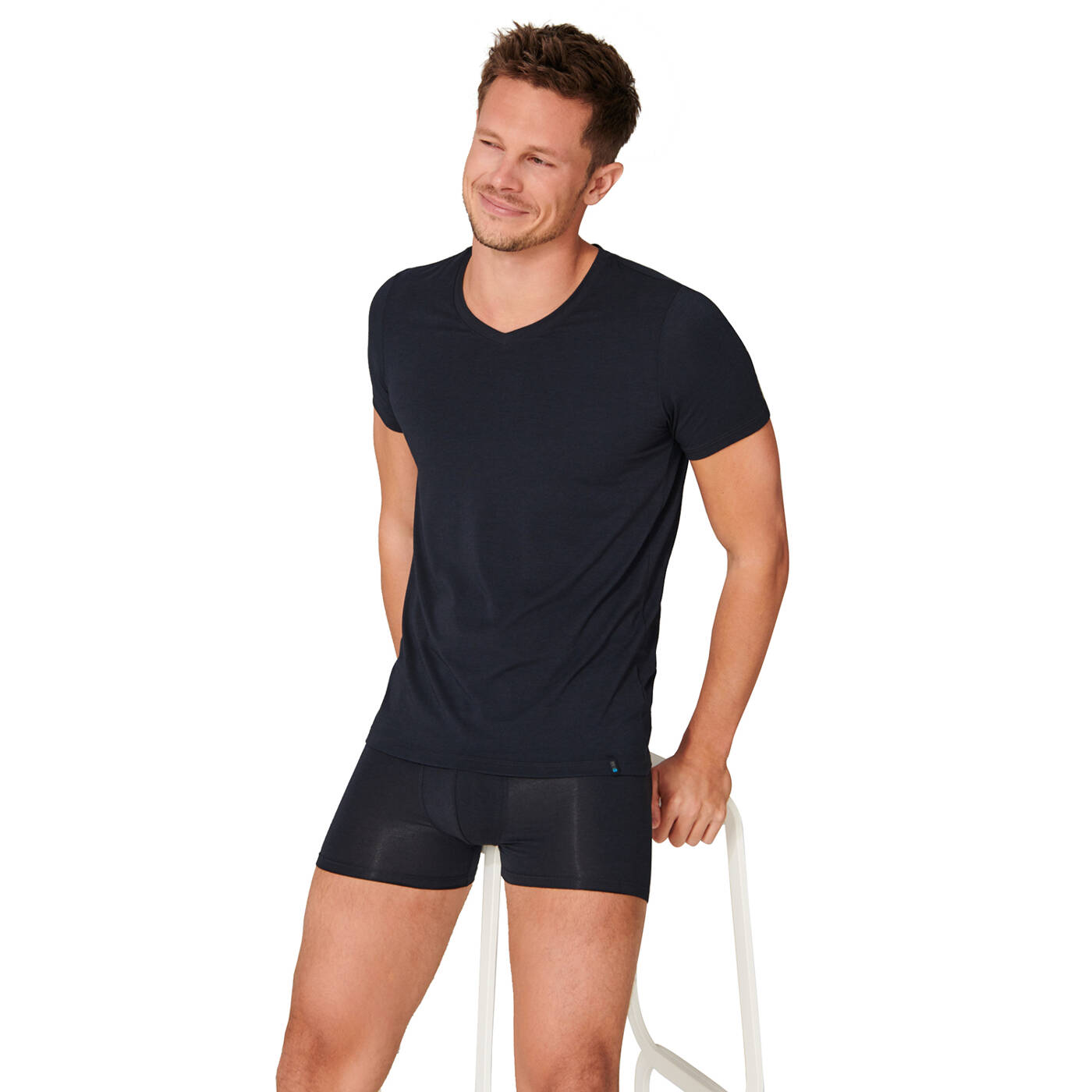 Dieses blauschwarze T-Shirt aus der SCHIESSER-Serie "Long Life Soft" ist genau das Richtige für Herren, die innovatives, pilling-armes Material in perfekter Passform schätzen. Hochwertiger, elastischer Single Jersey fühlt sich dabei angenehm glatt und weich an auf der Haut und sorgt mit dem ausgeglichenen Micromodal-Anteil für ein optimales Feuchtigkeitsmanagement. Ein langlebiges Shirt mit V-Ausschnitt, das sich sanft jeder Bewegung des Körpers anpasst und dadurch höchsten Tragekomfort gewährt.