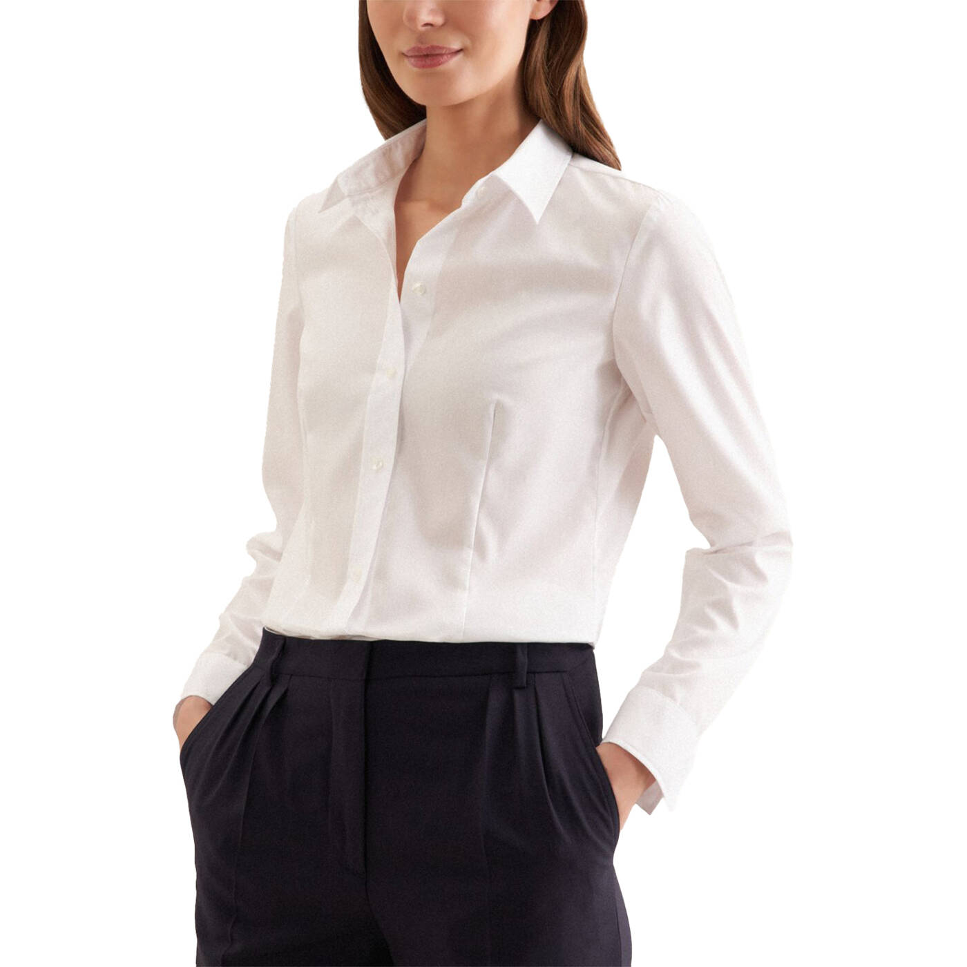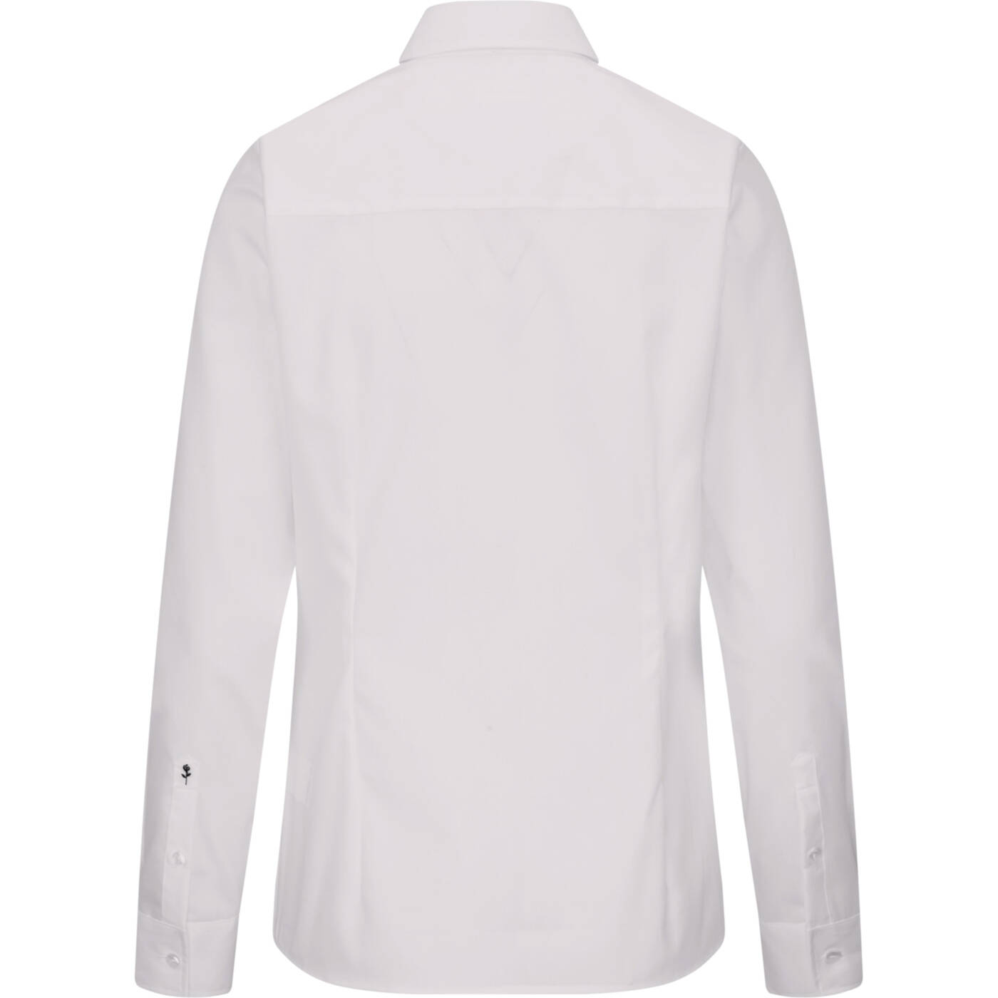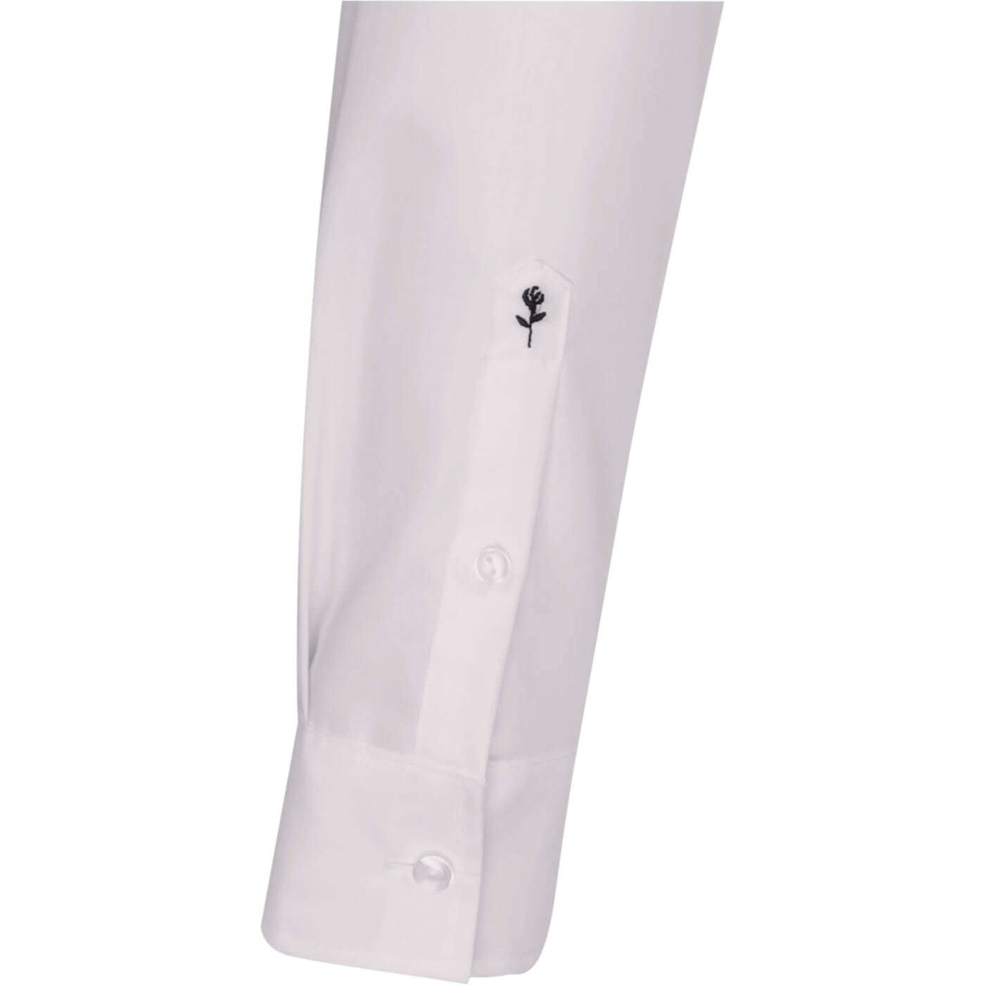 Klassische Langarm Hemdbluse mit modernem Kragen und schmaler gesteppeter Knopfleiste. Vorder- und Rückenteil mit formgebenden Abnähern, Rückenteil mit Passe. 1-Knopf-Manschetten und geknöpfte Dachschlitze mit Logostickerei Schwarze Rose auf dem linken Schlitz. Die Rückenlänge bei Gr. 36 beträgt 64 cm., Webart: Fil a fil, Materialeigenschaften: Bügelfrei