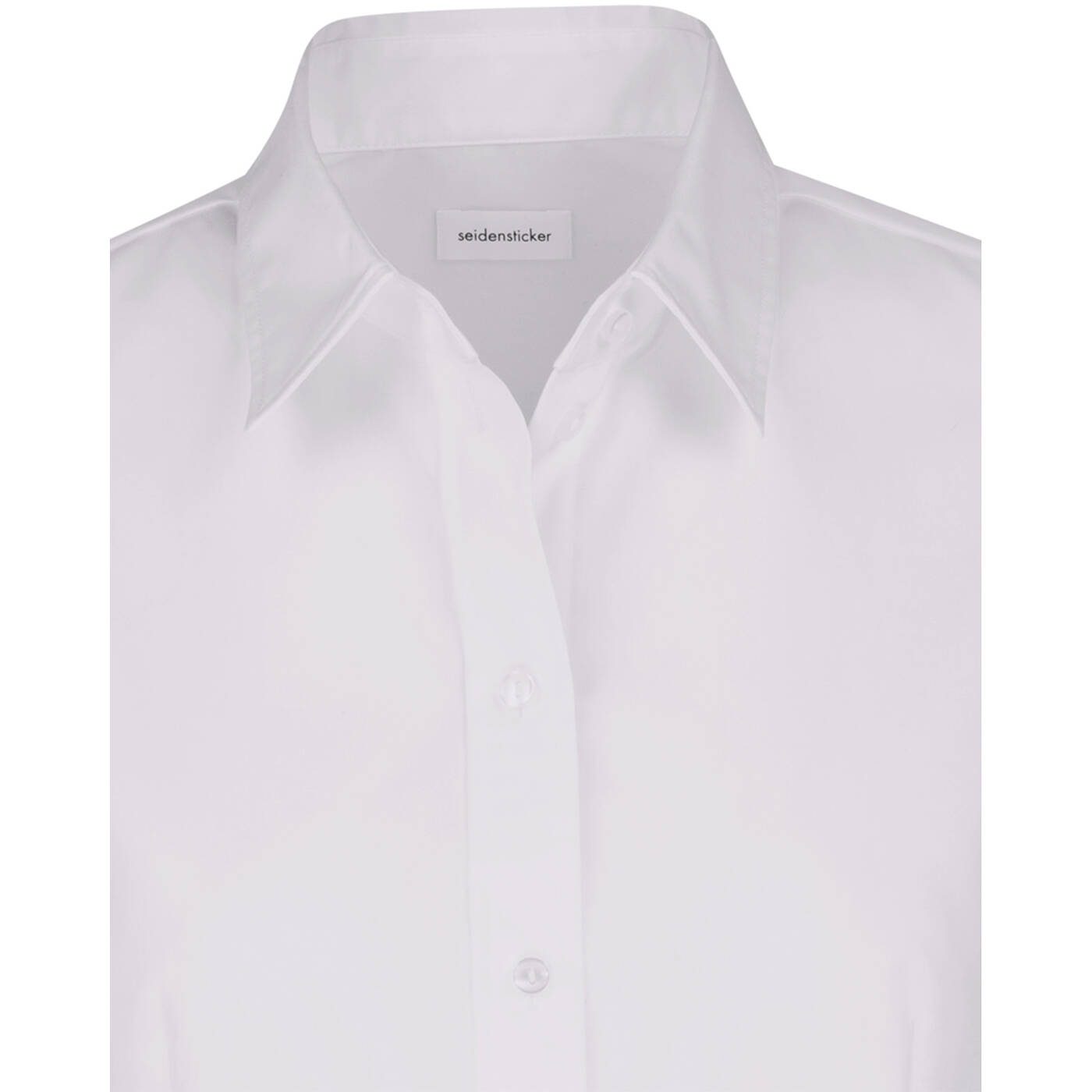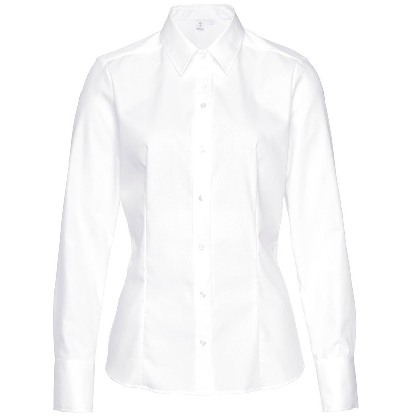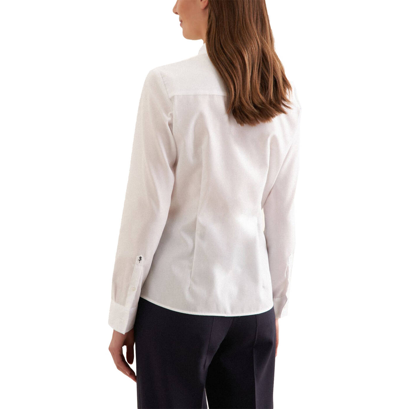 Klassische Langarm Hemdbluse mit modernem Kragen und schmaler gesteppeter Knopfleiste. Vorder- und Rückenteil mit formgebenden Abnähern, Rückenteil mit Passe. 1-Knopf-Manschetten und geknöpfte Dachschlitze mit Logostickerei Schwarze Rose auf dem linken Schlitz. Die Rückenlänge bei Gr. 36 beträgt 64 cm., Webart: Fil a fil, Materialeigenschaften: Bügelfrei