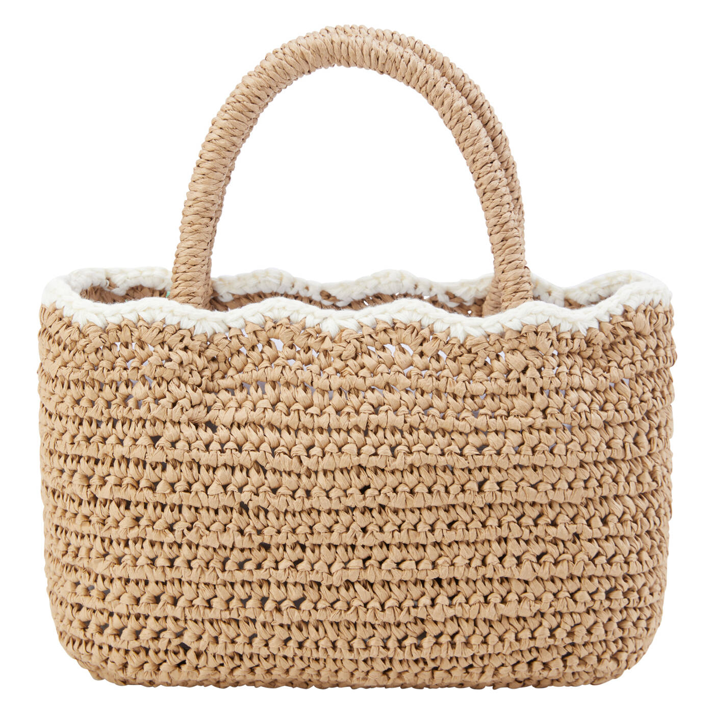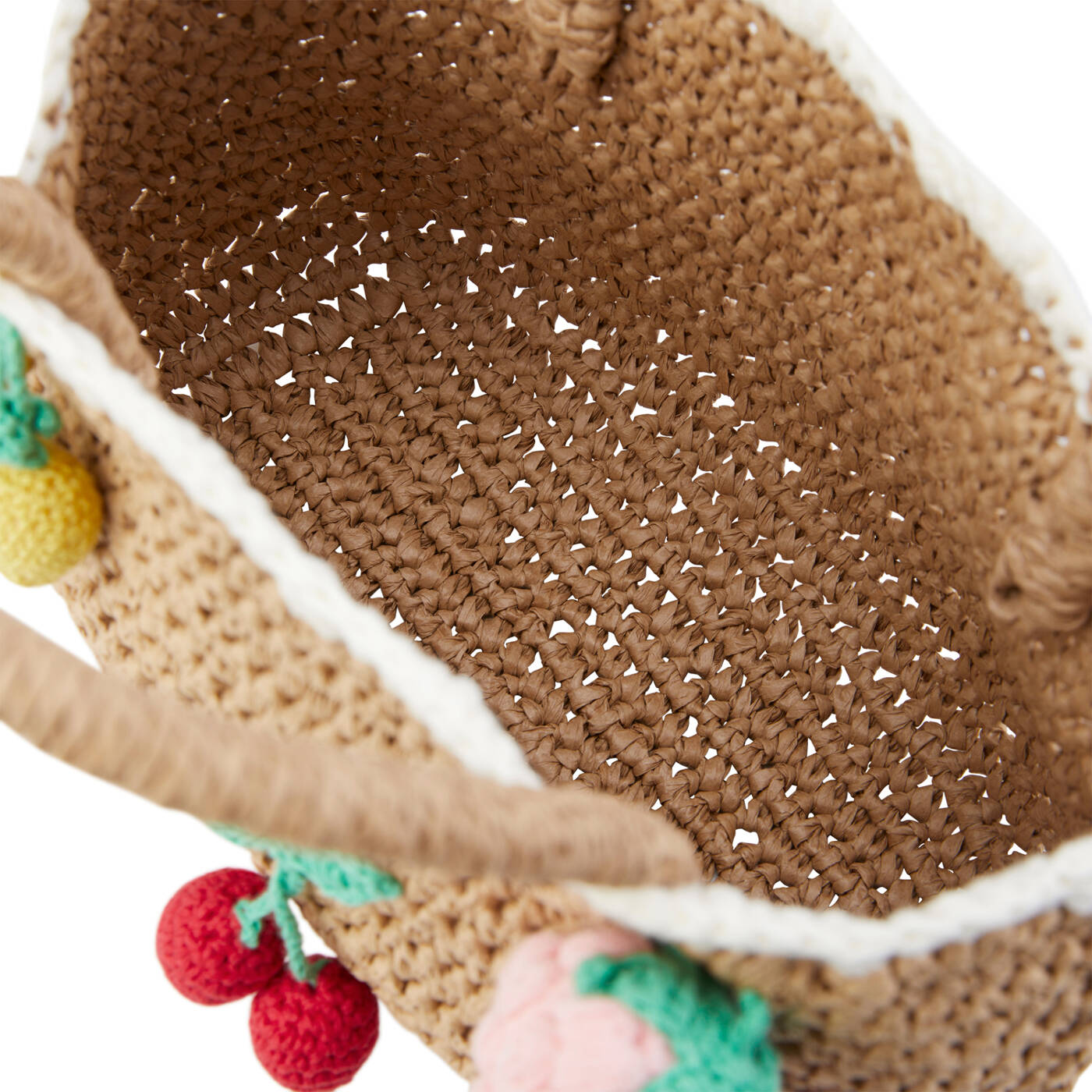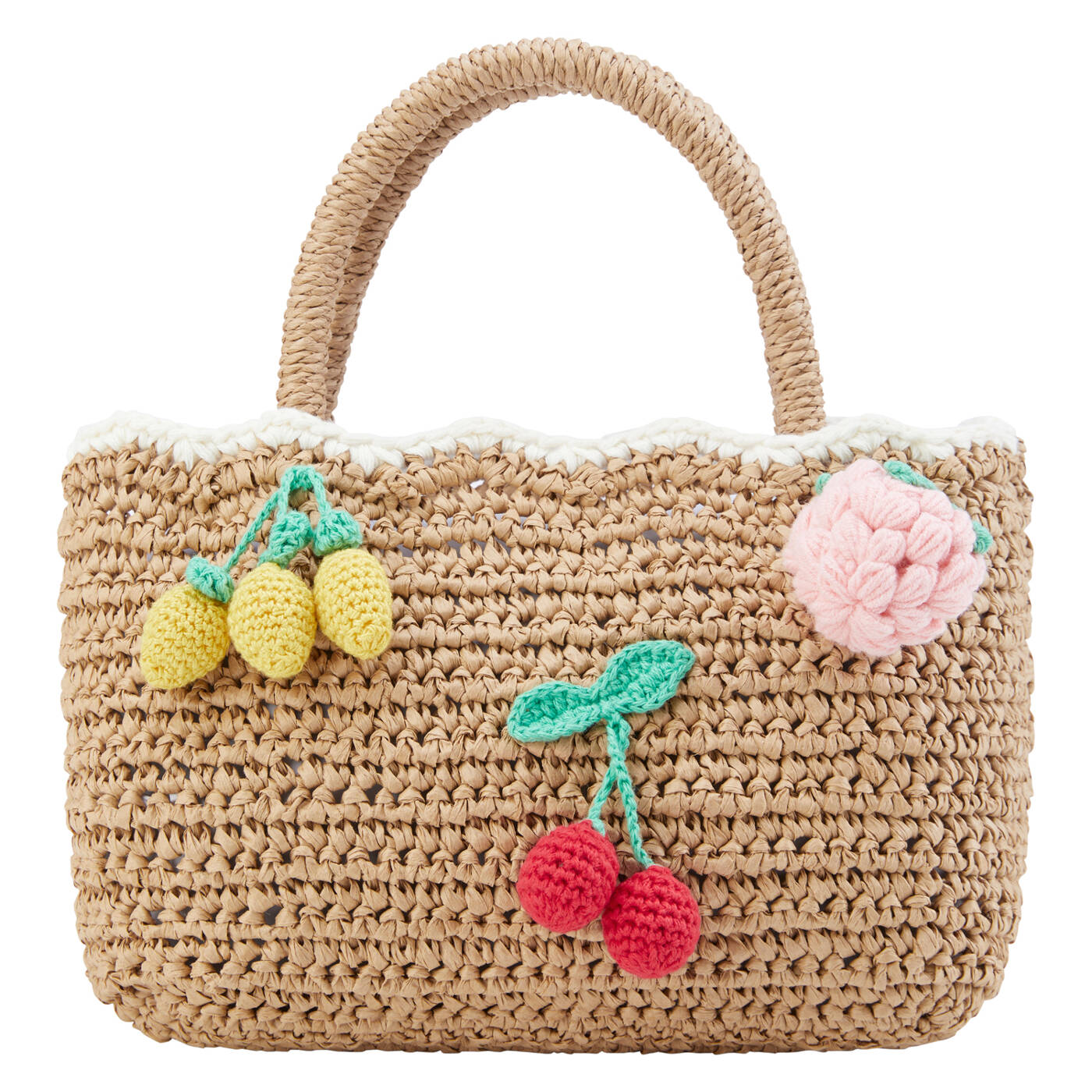 Versprüht fruchtigen Charme: Diese verspielte Raffia-Tasche ist mit gehäkelten Erdbeeren und Kirschen verziert und sorgt für eine besonders süße, handwerkliche Note