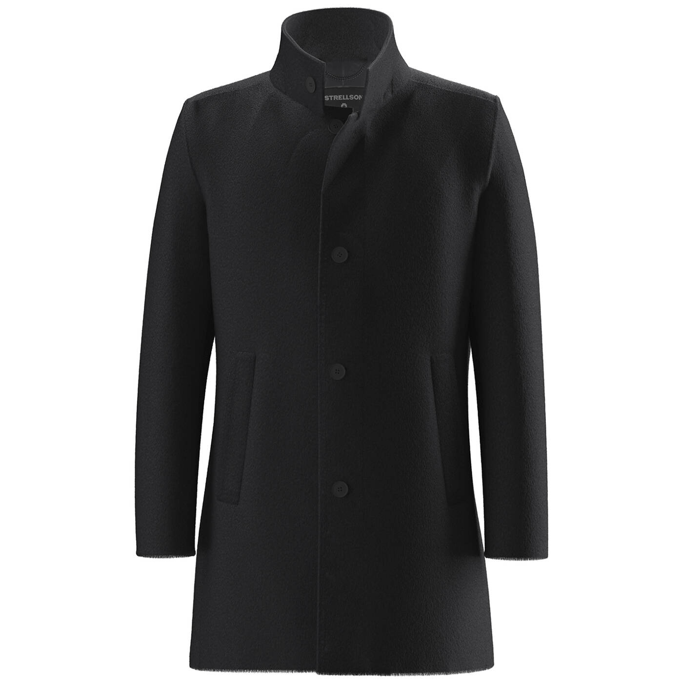 Ein klassischer Mantel mit hochstehendem Kragen, einer durchgeknöpften Knopfleiste und zwei seitlichen Taschen. Der Stoff ist leicht strukturiert. Ideal für kühles Wetter und formelle Anlässe.