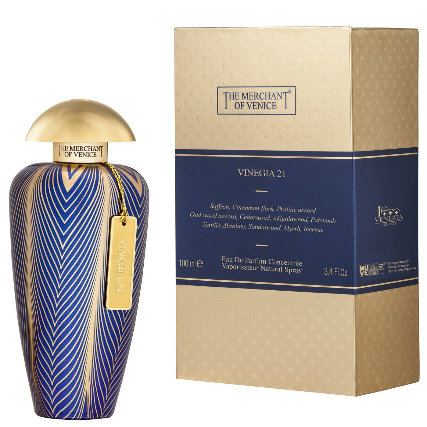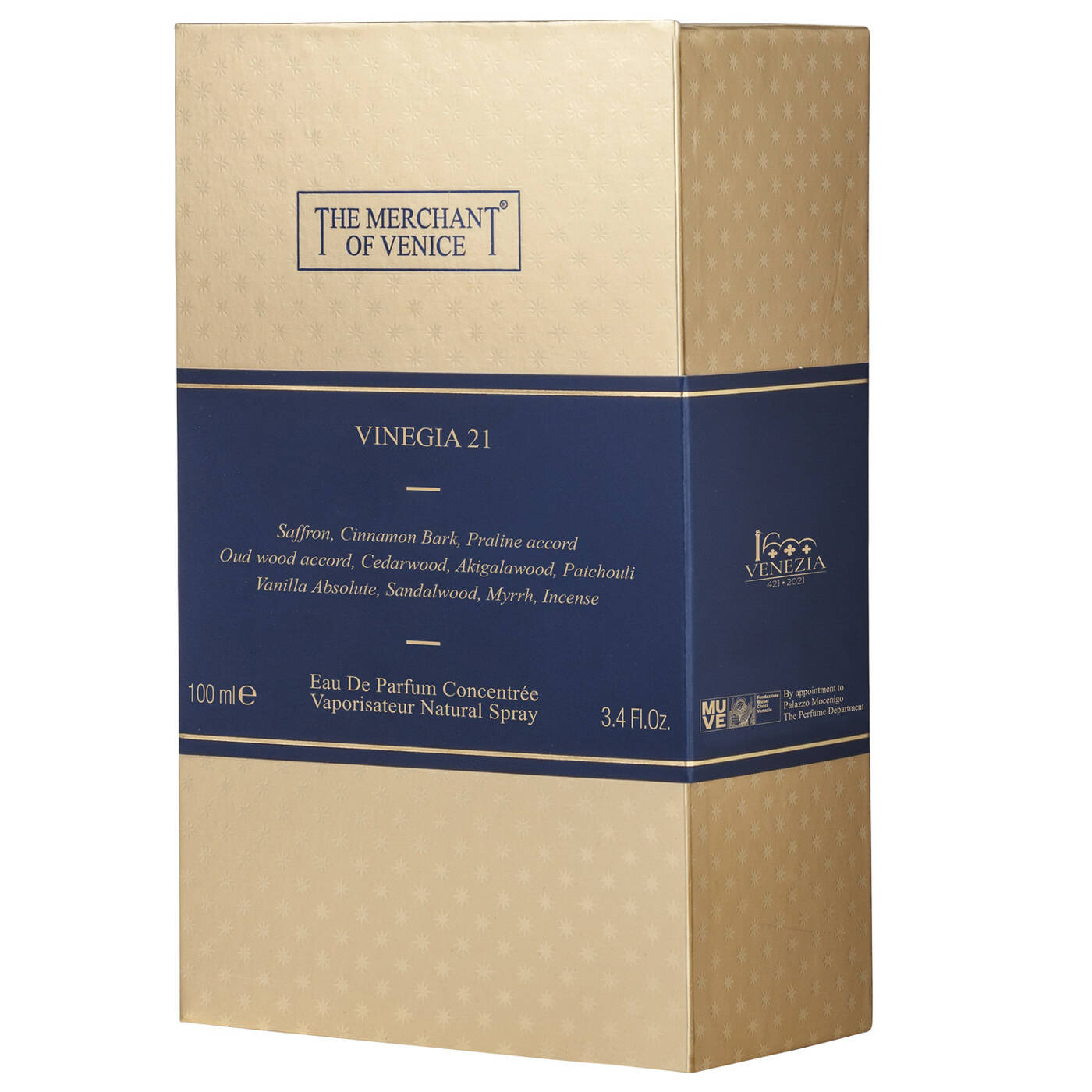 VINEGIA 21 ist inspiriert von einem zauberhaften Traum, in dem die Reichtümer der alten Hafenstadt entdeckt werden: Neben prächtigen Brokatstoffen und Samt, findet man würziges Zimtpulver, goldene Safranfäden und Pralinen. Kostbare Hölzer erinnern an die Düfte eines Waldes bei Sonnenuntergang und Oud-Noten lassen unvergessliche orientalische Nächte wieder aufleben. Cremige Vanille und betörendes Sandelholz verbinden sich zuletzt mit den rauchigen Noten von Myrrhe und Weihrauch.