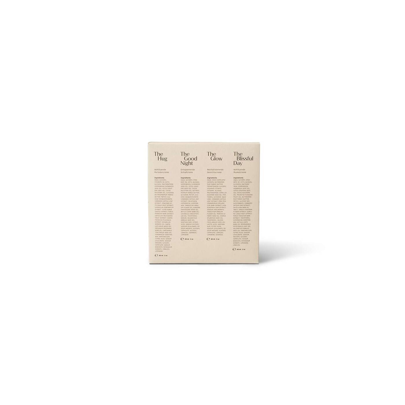 Mit diesem Premiumset bist Du von Kopf bis Schlaf auf Self-Care eingestellt. Im minimalistischen Design-Packaging erwarten Dich vier innovative Cremes in ausbalancierten Formulierungen, die Dich sanft aber wirkungsvoll durch jede Alltagssituation begleiten.