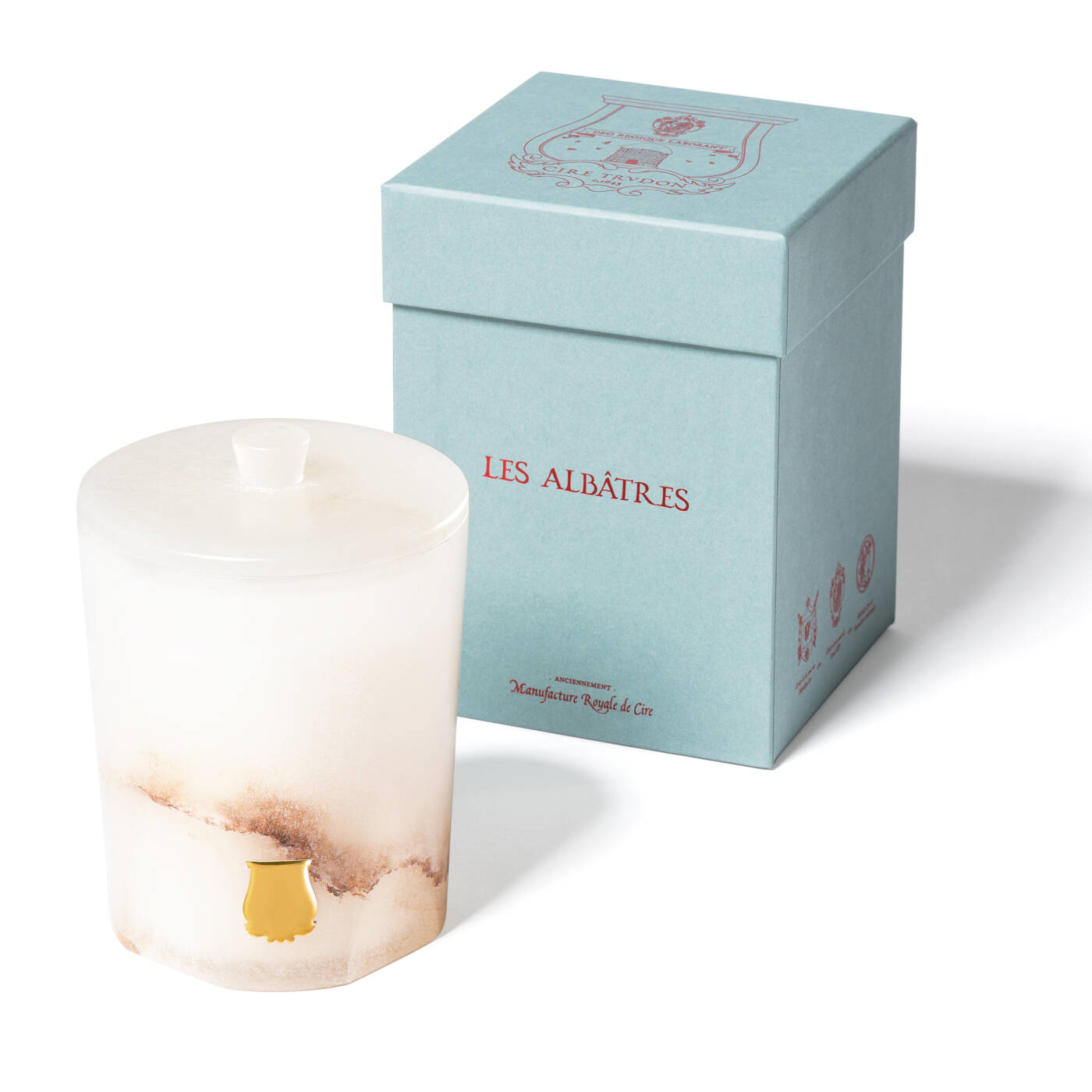 Der Alabaster ersetzt das traditionelle Glas und schützt die Duftkerzen mit einem Deckel im gleichen Farbton.