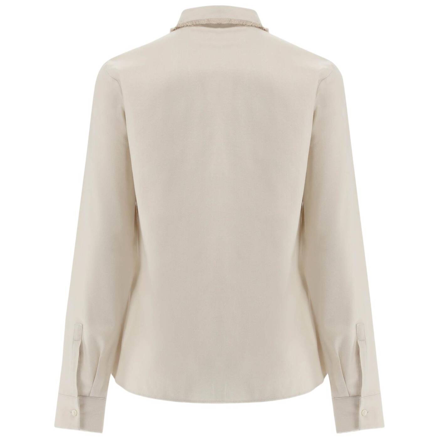 Fransenkante am Kragen und verdeckter Knopfleiste